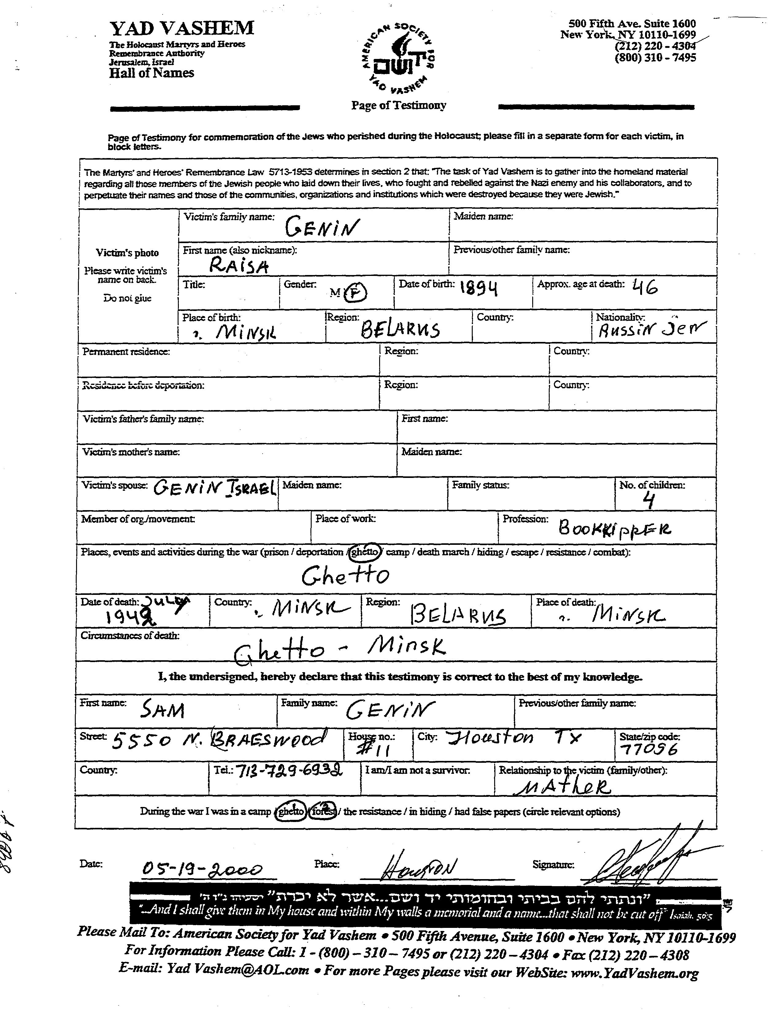 רייסה נרצחה בשואה. מקום המוות: Minsk שבביאלורוסיה (ברה"מ) בשנת 1942.