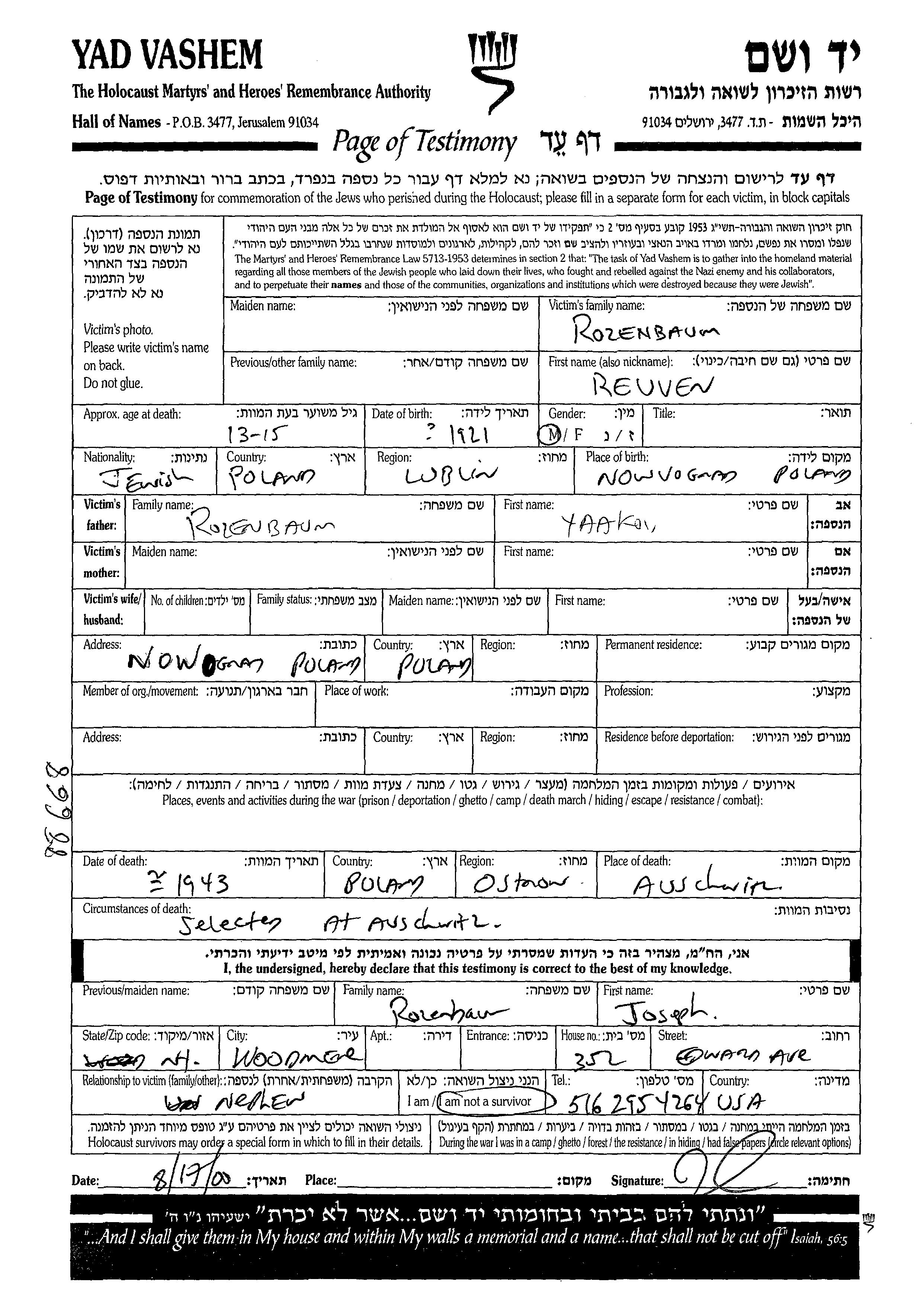 ראובן נרצח בשואה. מקום המוות: Auschwitz שבפולין בשנת 1943.