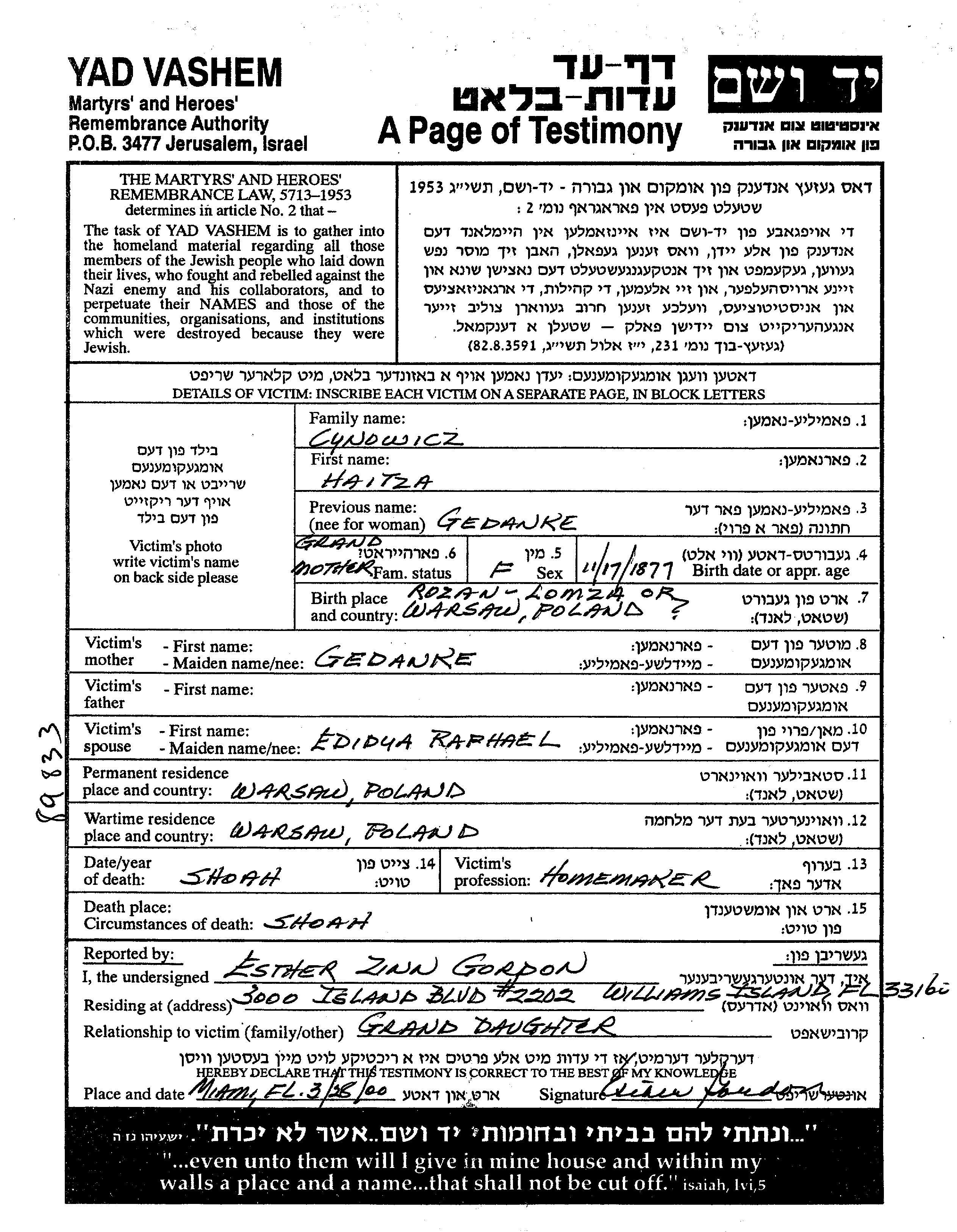 Haitza Cynowicz לבית גדנקה נולדה בפולין שבפולין בשנת 1877. היא היתה נשואה לEdidua Raphael. לפני מלחמת העולם השניה התגוררה בWarszawa שבפולין. בזמן המלחמה היא היתה בWarszawa שבפולין.