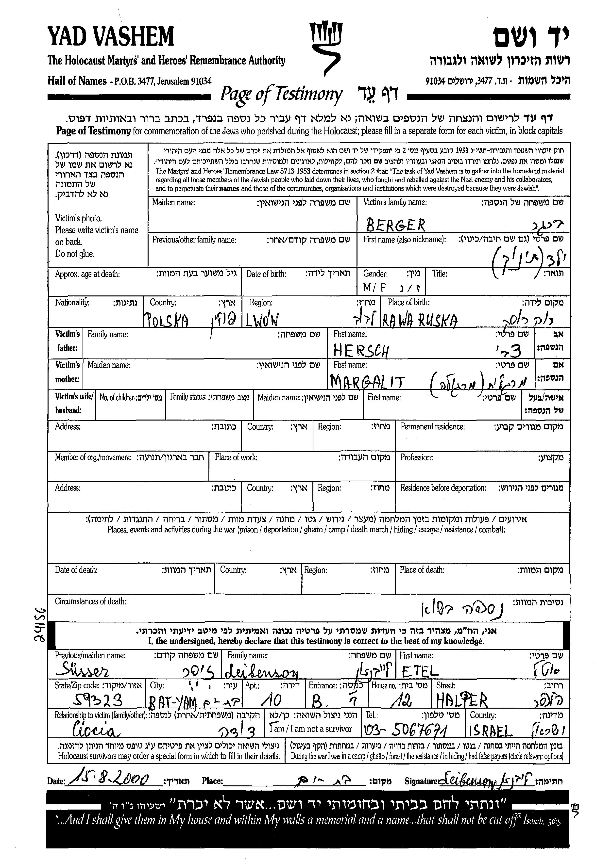 שם פרטי לא ידוע ברגר נולד בRawa Ruska שבפולין לHersch צבי וMargalit. הוא היה תינוק.