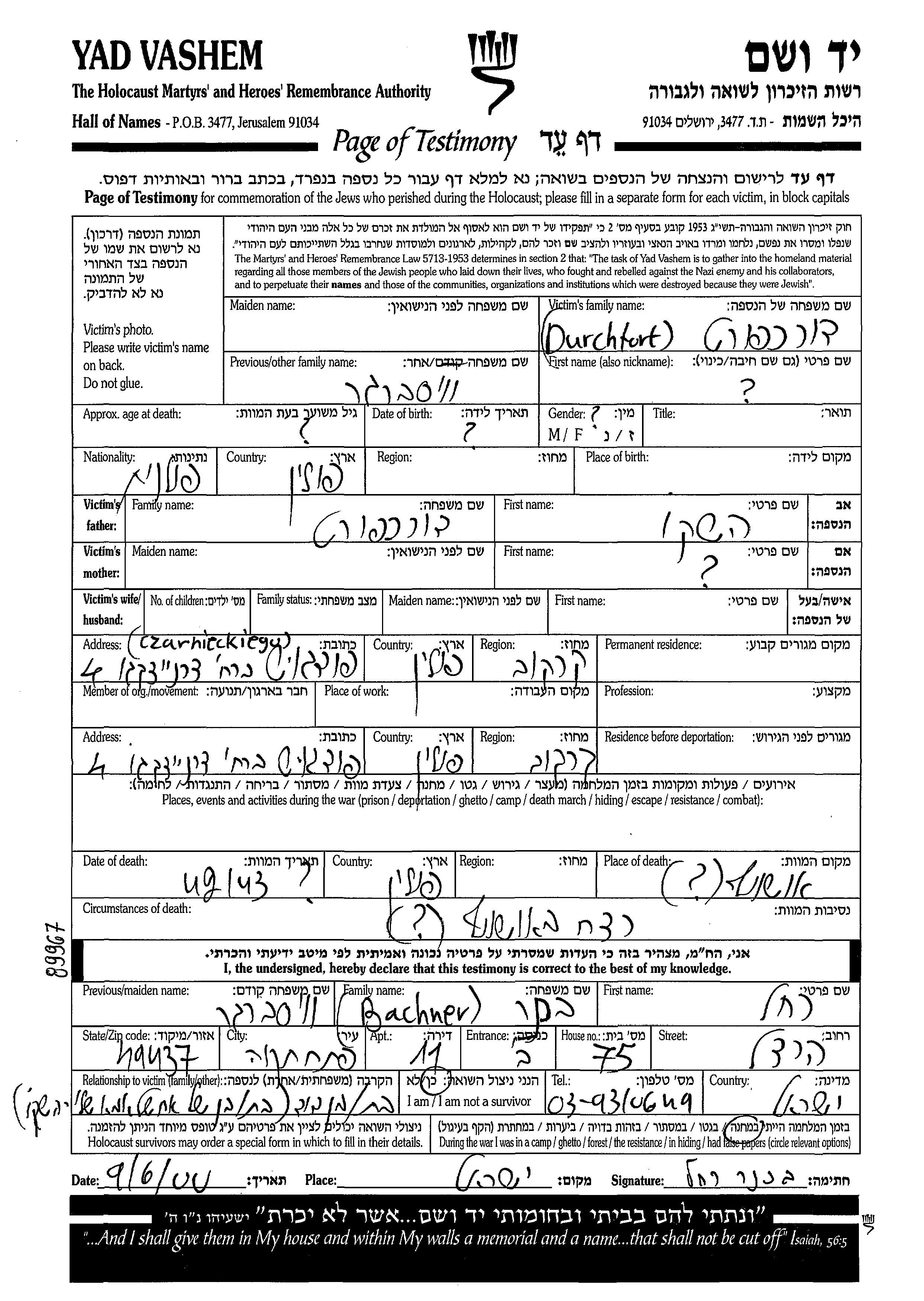 שם פרטי לא ידוע Durchfort לבית וויסברגר נולד/ה בפולין להשקו. לפני מלחמת העולם השניה התגורר/התגוררה בKrakow שבפולין. בזמן המלחמה הוא/היא היה/היתה בKrakow שבפולין. נרצח/ה בשואה. מקום המוות: Auschwitz שבפולין.