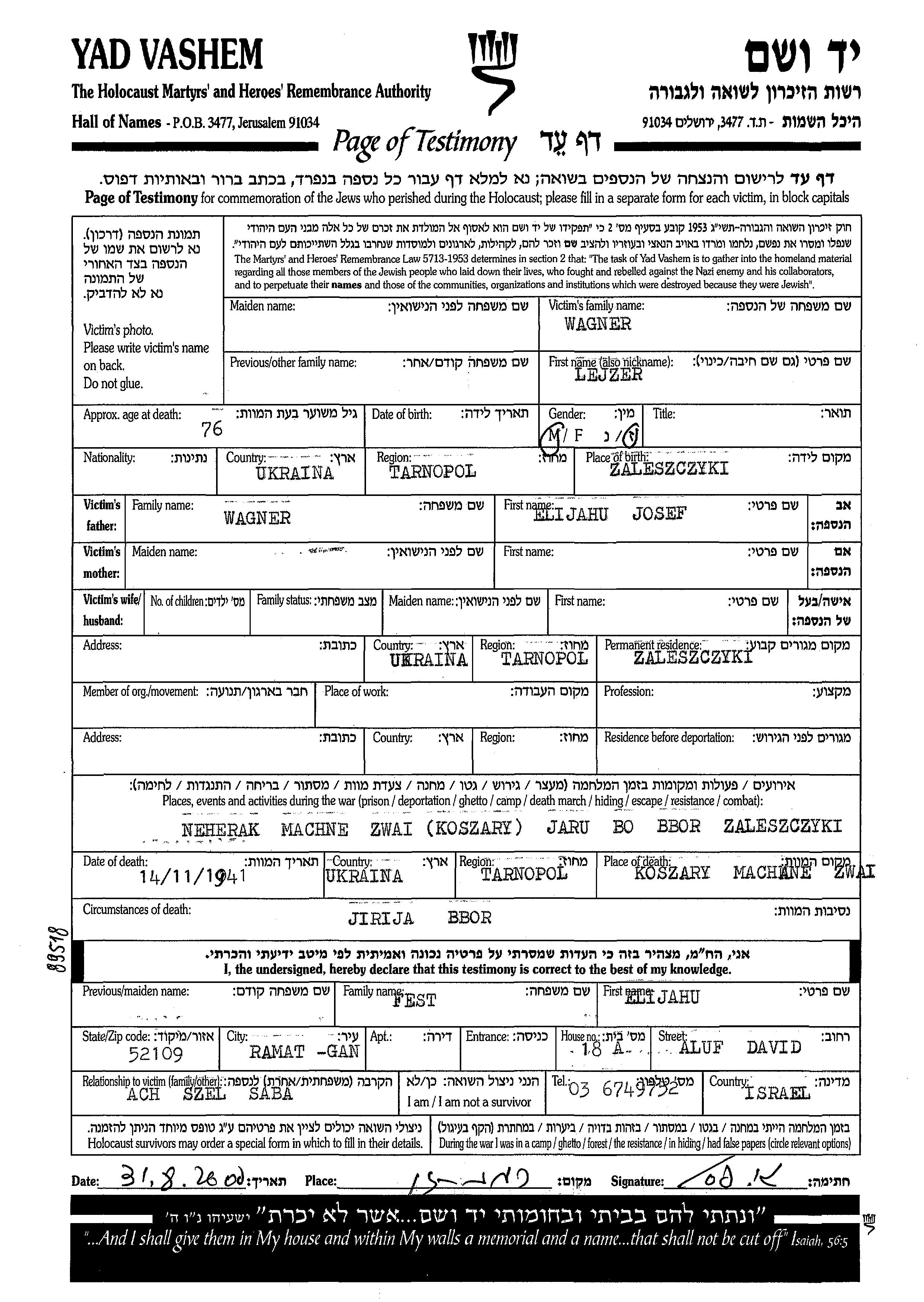 Lejzer Wagner נולד בZaleszczyki שבפולין לElijahu Josef. לפני מלחמת העולם השניה התגורר בZaleszczyki שבפולין. בזמן המלחמה הוא היה בZaleszczyki שבפולין. הוא נרצח בשואה. מקום המוות: Zaleszczyki שבפולין בשנת 1941.