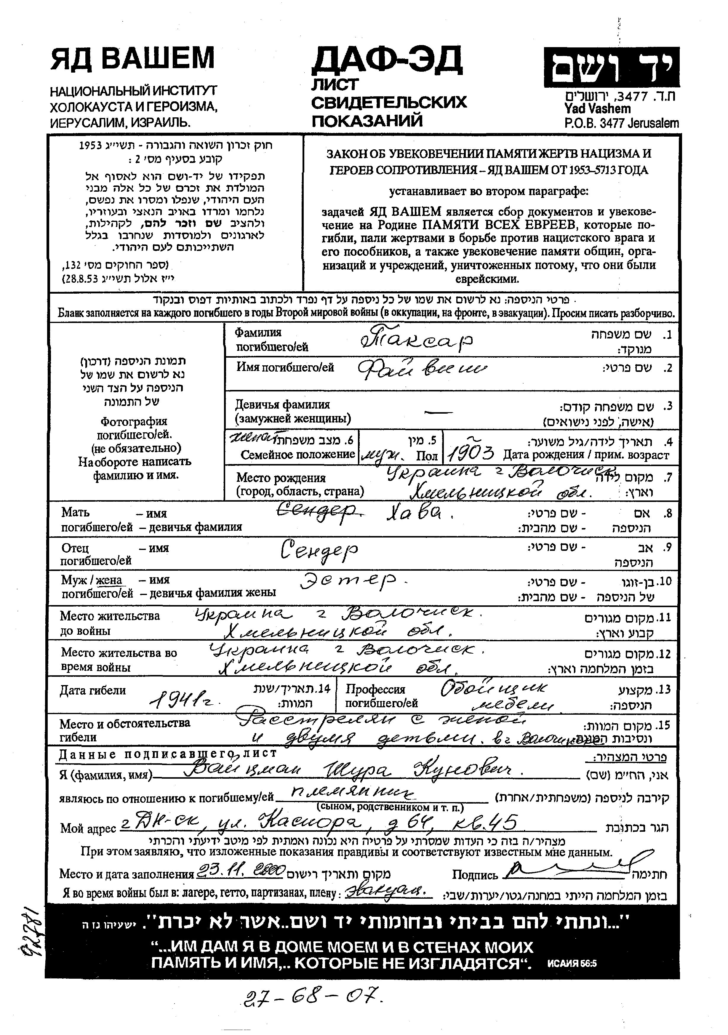 הוא נרצח בשואה. מקום המוות: Volochisk שבאוקראינה (ברה"מ) בשנת 1941.