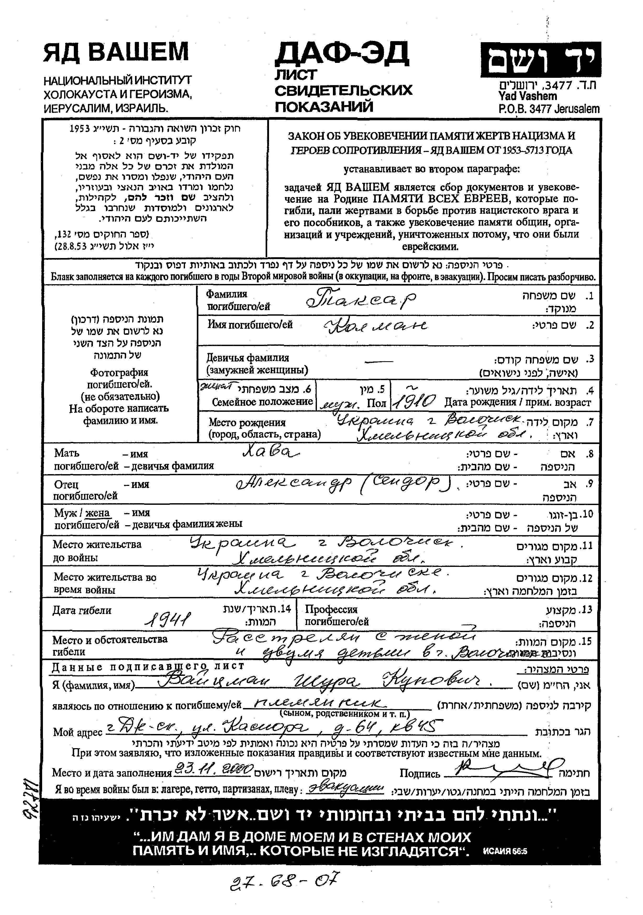 קלמן נרצח בשואה. מקום המוות: Volochisk שבאוקראינה (ברה"מ) בשנת 1941.