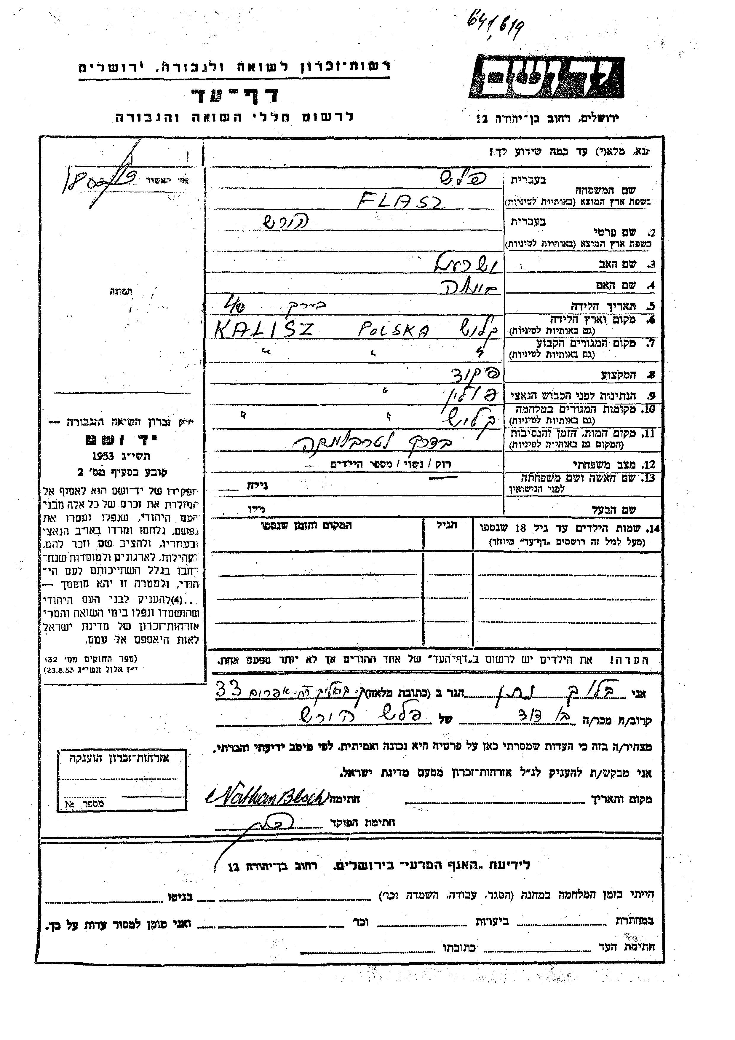 הירש Flasz נולד בKalisz שבפולין לישראל וגאולה. הוא היה פקיד ורווק. לפני מלחמת העולם השניה התגורר בKalisz שבפולין. בזמן המלחמה הוא היה בKalisz שבפולין.