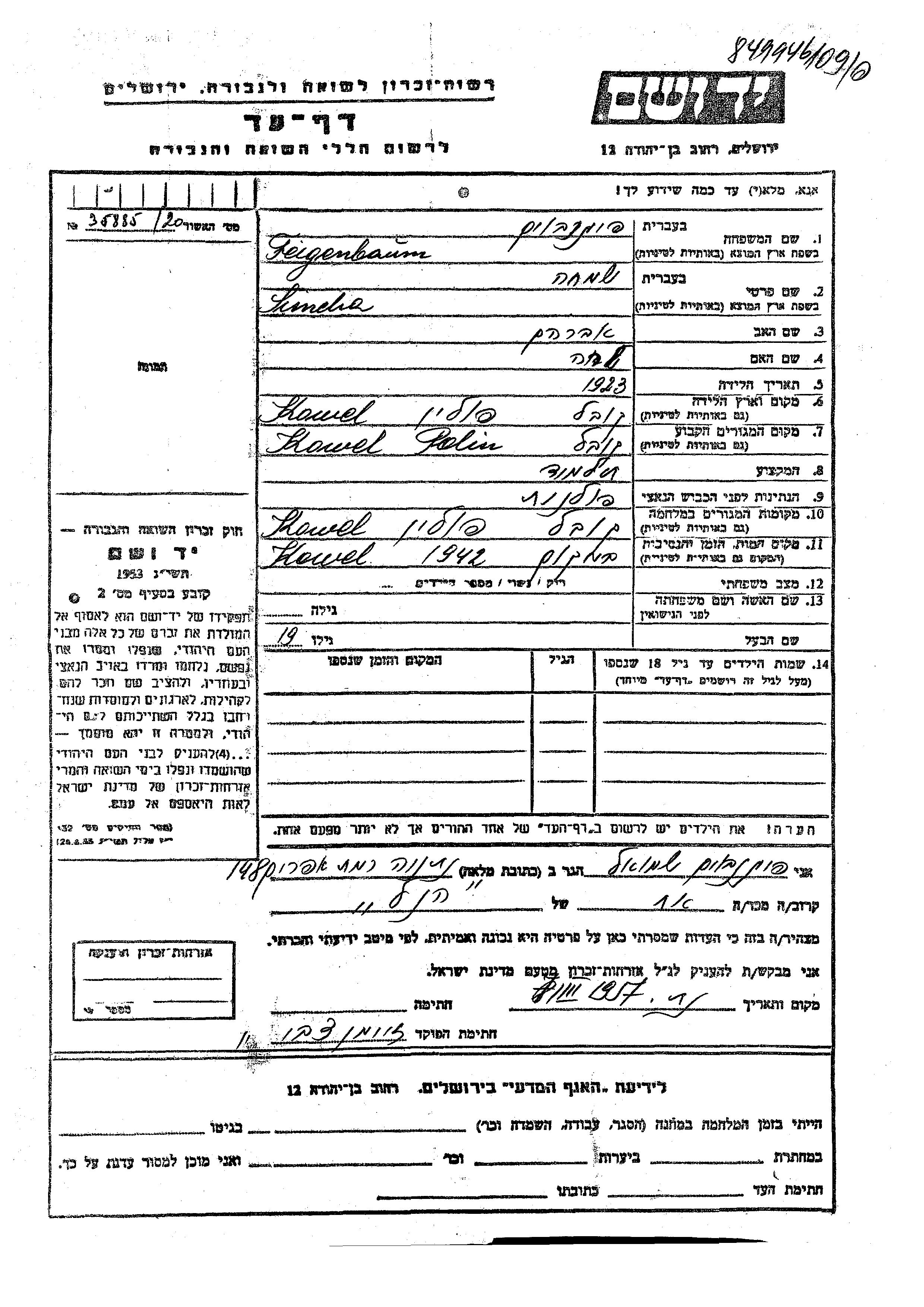 Simcha Feigenboim נולד בKowel שבפולין בשנת 1923 לאברהם ושרה. הוא היה תלמיד. לפני מלחמת העולם השניה התגורר בKowel שבפולין. בזמן המלחמה הוא היה בKowel שבפולין. הוא נרצח בשואה. מקום המוות: Kowel שבפולין בשנת 1942.