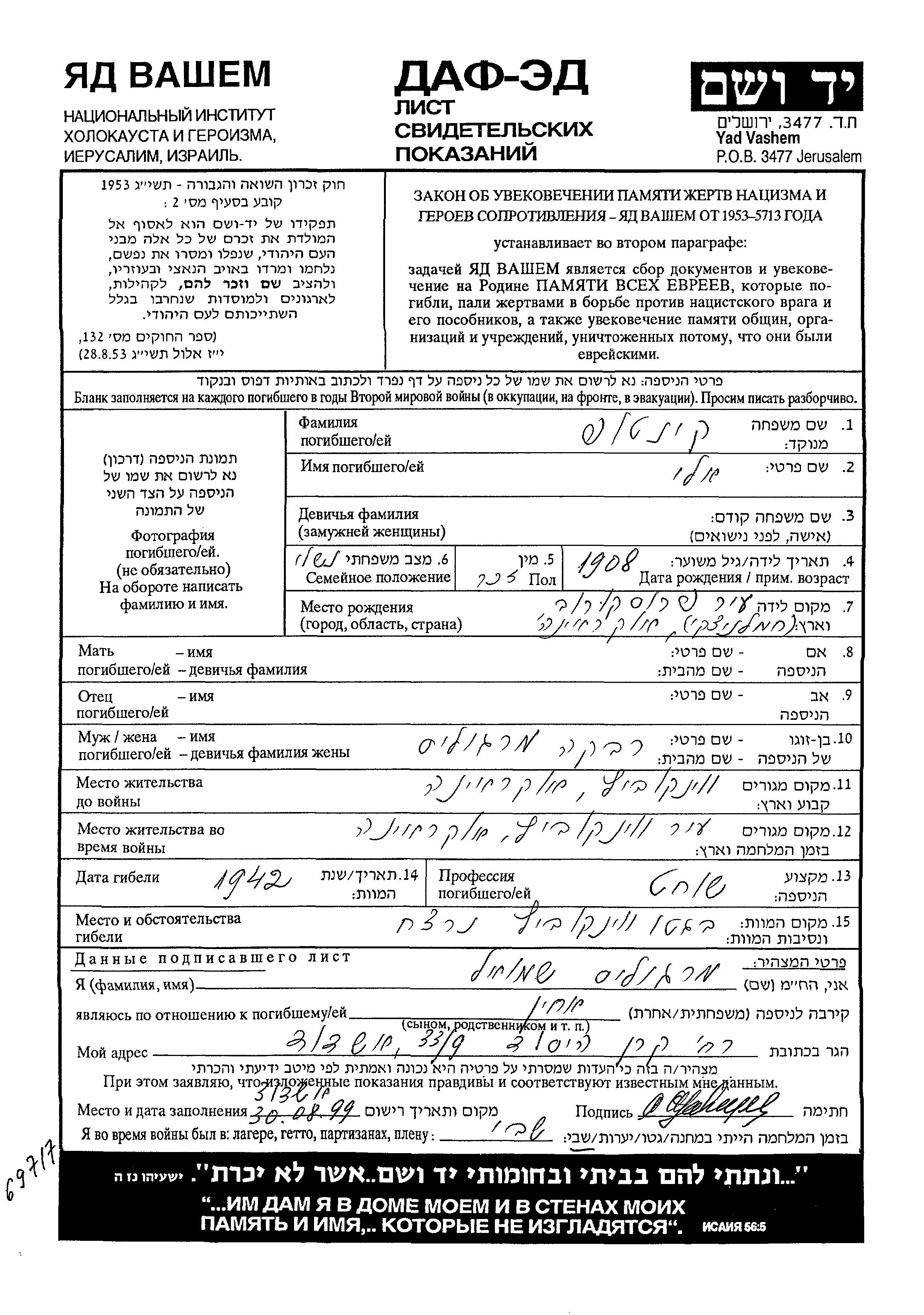 אלי נרצח בשואה. מקום המוות: Vinkovitz שבאוקראינה (ברה"מ) בשנת 1942.
