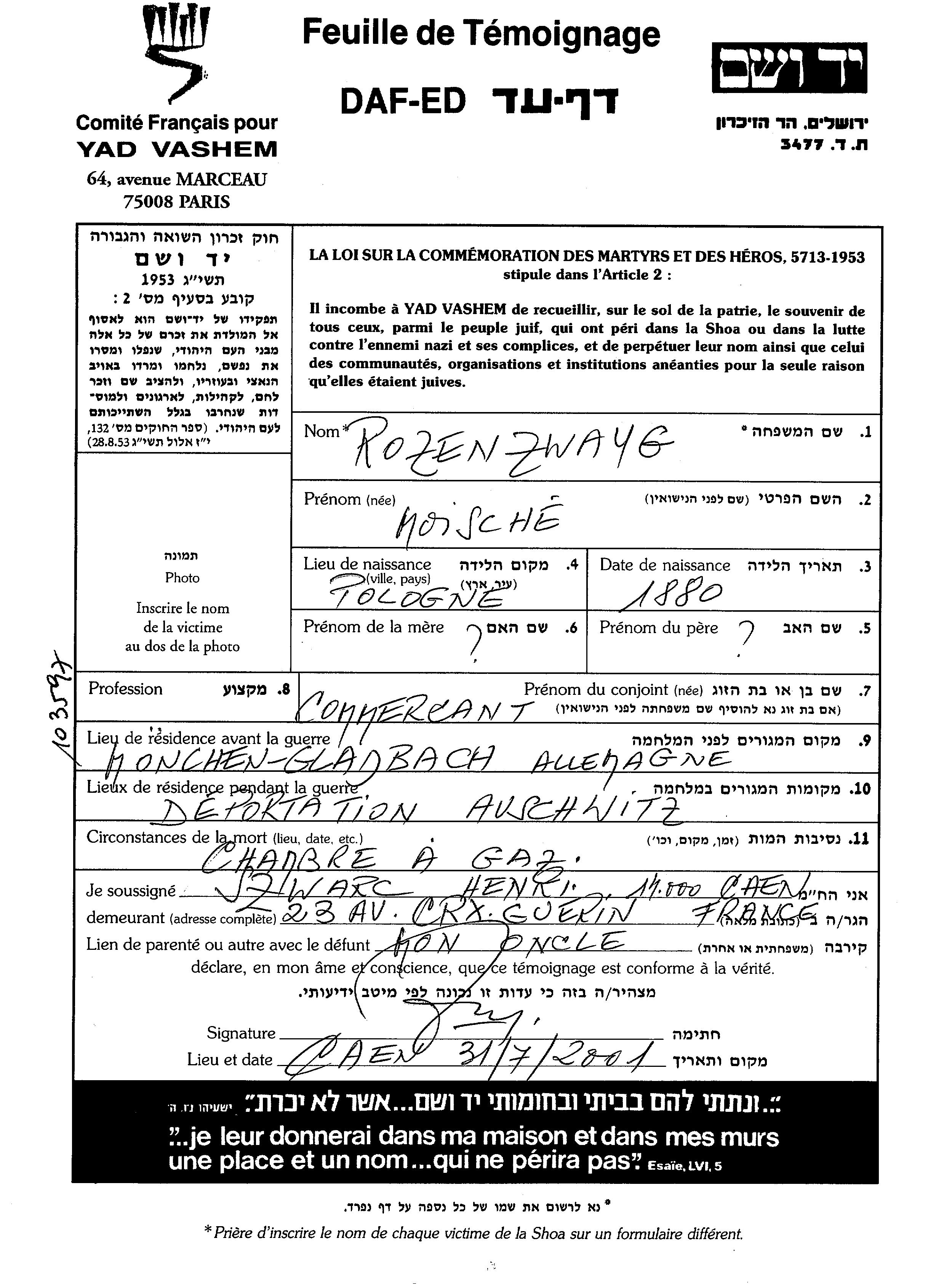 Moische Rozenzwayg נולד בפולין בשנת 1880. הוא היה סוחר. לפני מלחמת העולם השניה התגורר בMoenchen Gladbach שבגרמניה.
