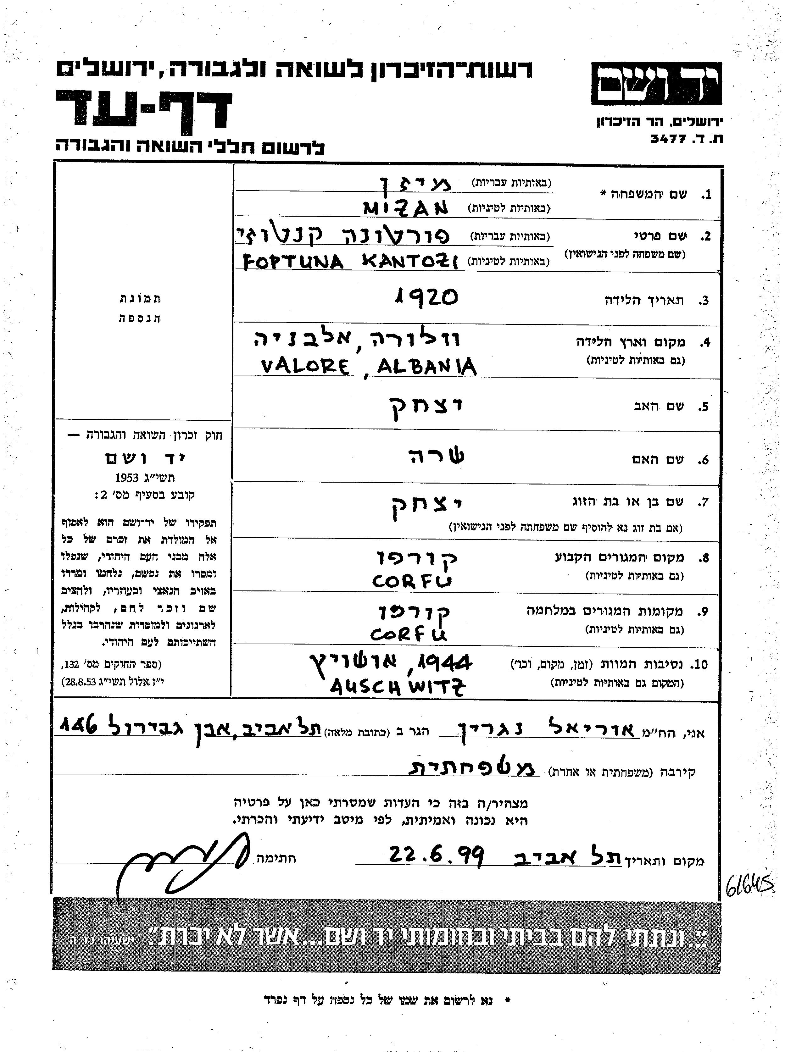 פורטונה מיזן לבית Kantozi נולדה בVlore שבאלבניה בשנת 1920 ליצחק ושרה. לפני מלחמת העולם השניה התגוררה בCorfu שביון. בזמן המלחמה היא היתה בCorfu שביון. פורטונה נרצחה בשואה. מקום המוות: Auschwitz שבפולין בשנת 1944.