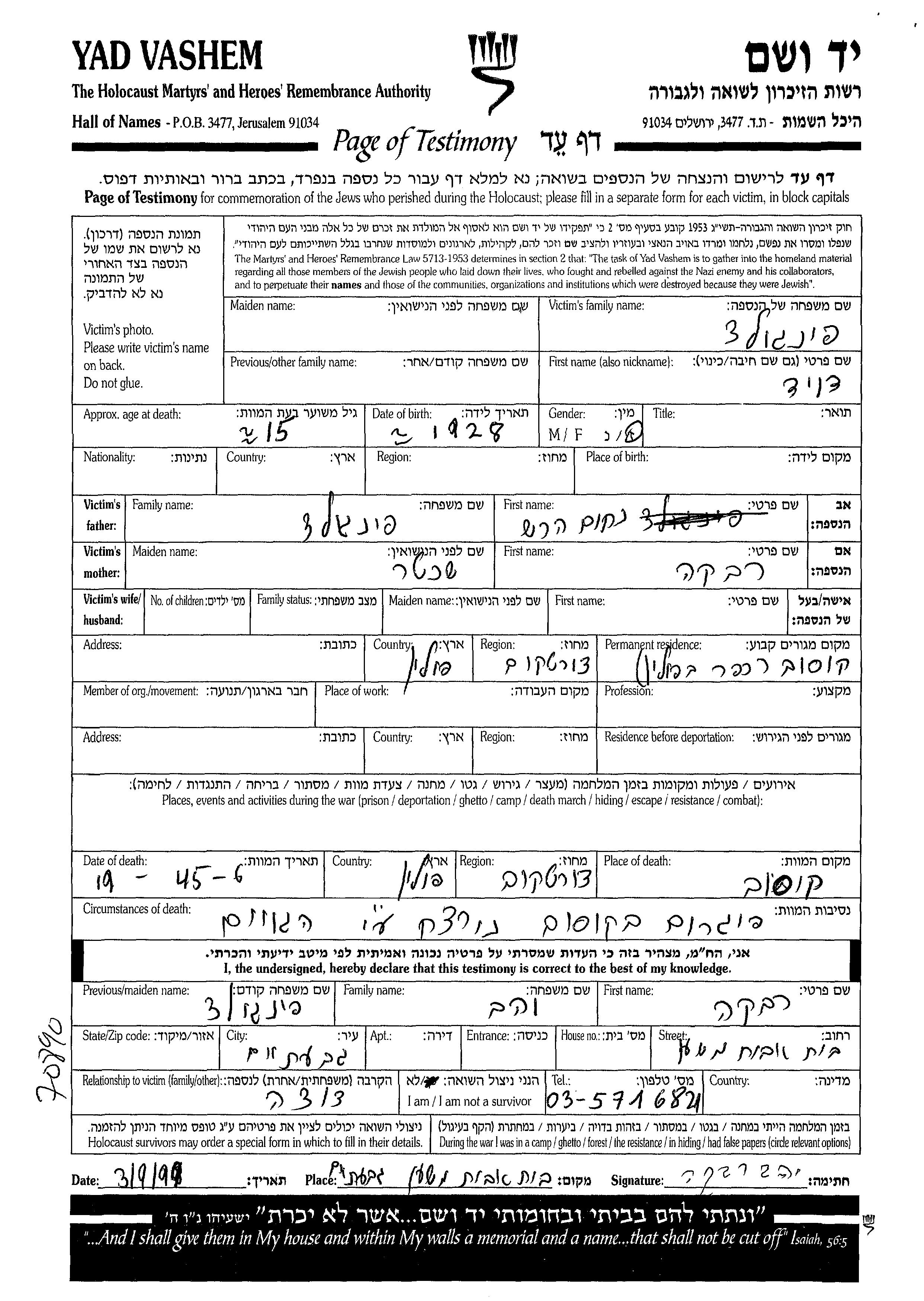 חיפוש שם מוסר דף העד. חיפוש לפי כל שם פרטי, כולל כינוי או שם חיבה