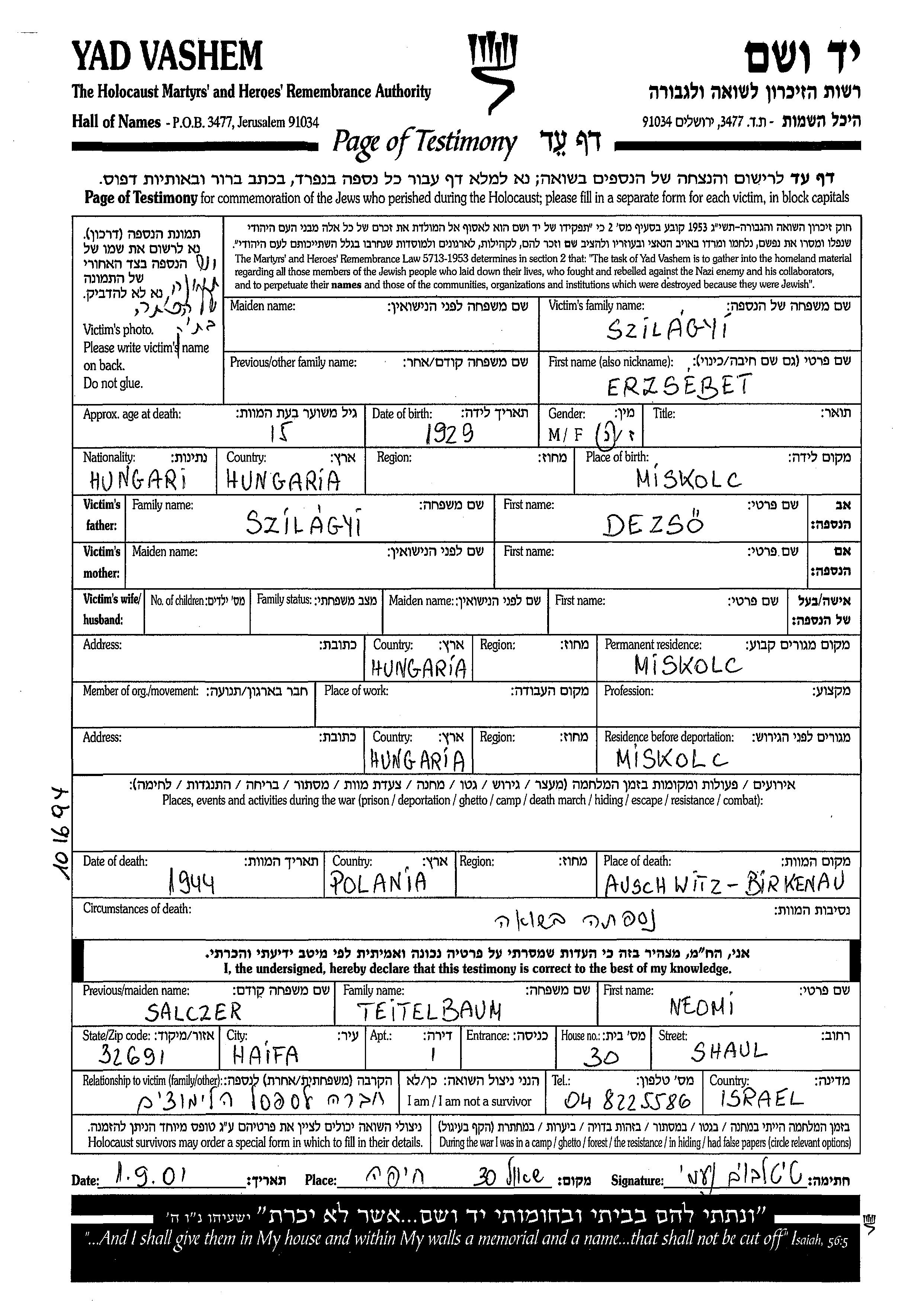 Erzsebet Szilagyi נולדה בMiskolc שבהונגריה בשנת 1929 לDezso. לפני מלחמת העולם השניה התגוררה בMiskolc שבהונגריה. בזמן המלחמה היא היתה בMiskolc שבהונגריה.