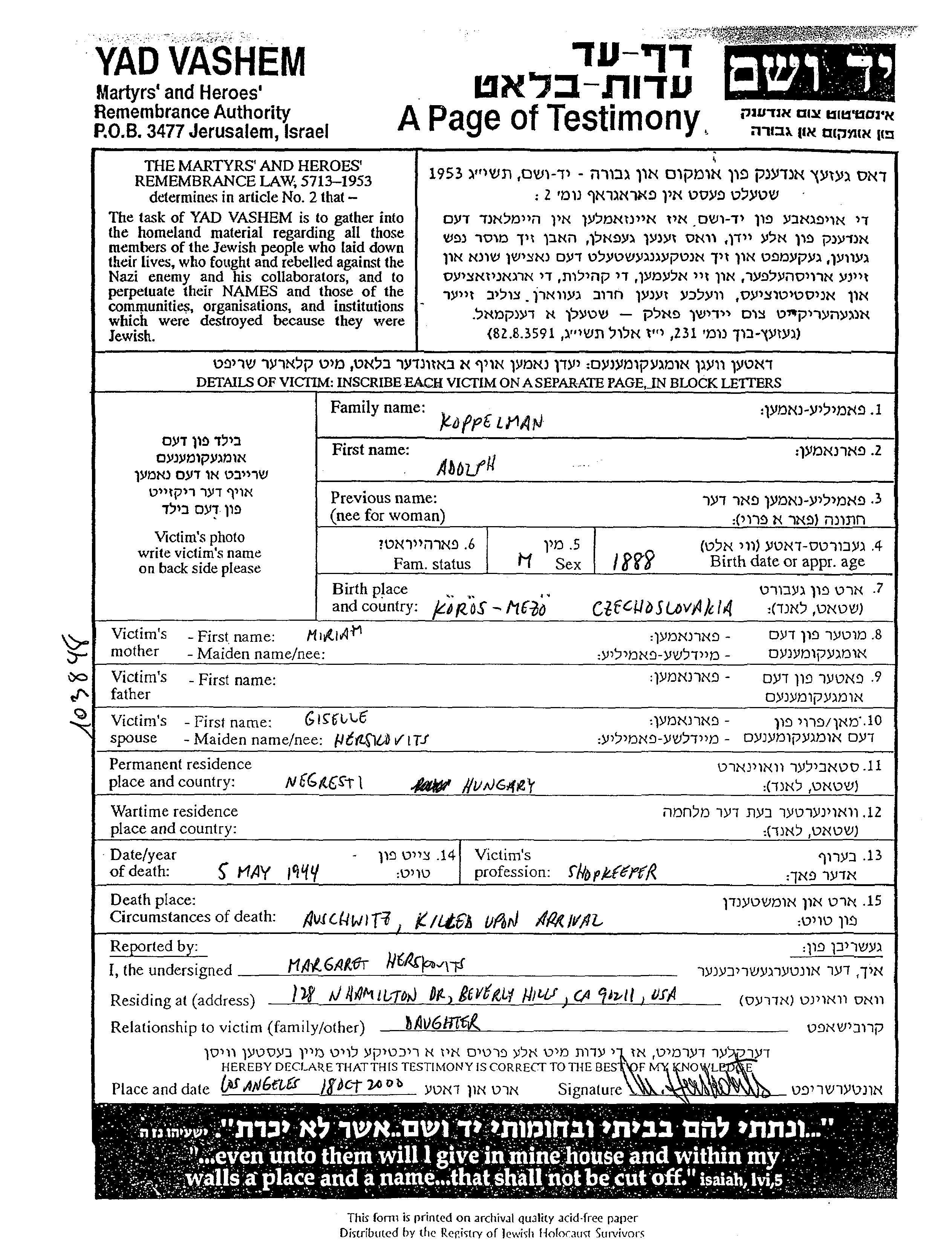 Adolph Koppelman נולד בKorosmezo שבצ'כוסלובקיה בשנת 1888 למרים. הוא היה בעל חנות. לפני מלחמת העולם השניה התגורר בNegresti שברומניה. הוא נרצח בשואה. מקום המוות: Auschwitz שבפולין בשנת 1944.