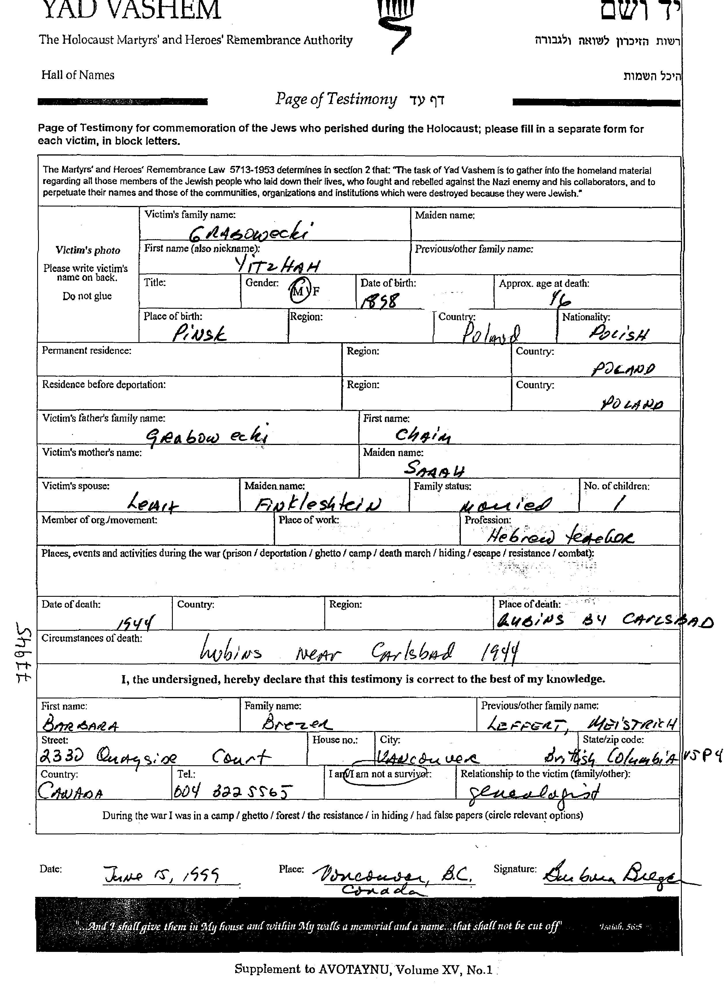 Yitzhah Grabowecki נולד בPinsk שבפולין בשנת 1858 לחיים וSarah. הוא היה Hebrew teacher ונשוי לLeah לבית פינקלשטיין. לפני מלחמת העולם השניה התגורר בפולין. בזמן המלחמה הוא היה בפולין. הוא נרצח בשואה. מקום המוות: Lubenec שבצ'כוסלובקיה בשנת 1944.