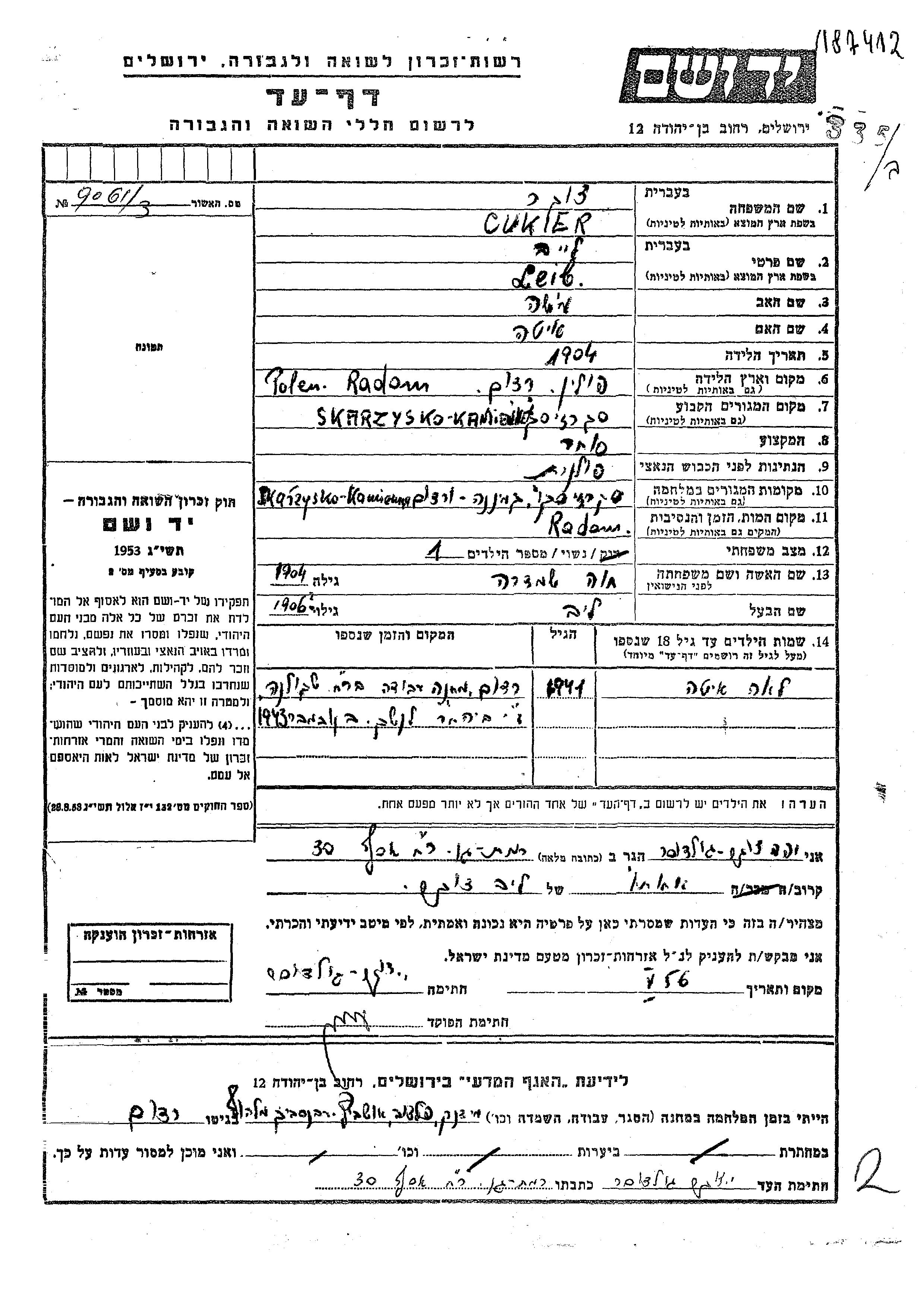 לייב Cukier נולד בRadom שבפולין בשנת 1904 למשה ואיטה. הוא היה סוחר ונשוי לחוה לבית שמדרה. לפני מלחמת העולם השניה התגורר בSkarzysko Kamienna שבפולין. בזמן המלחמה הוא היה בSkarzysko Kamienna שבפולין. לייב נרצח בשואה. מקום המוות: Radom שבפולין.