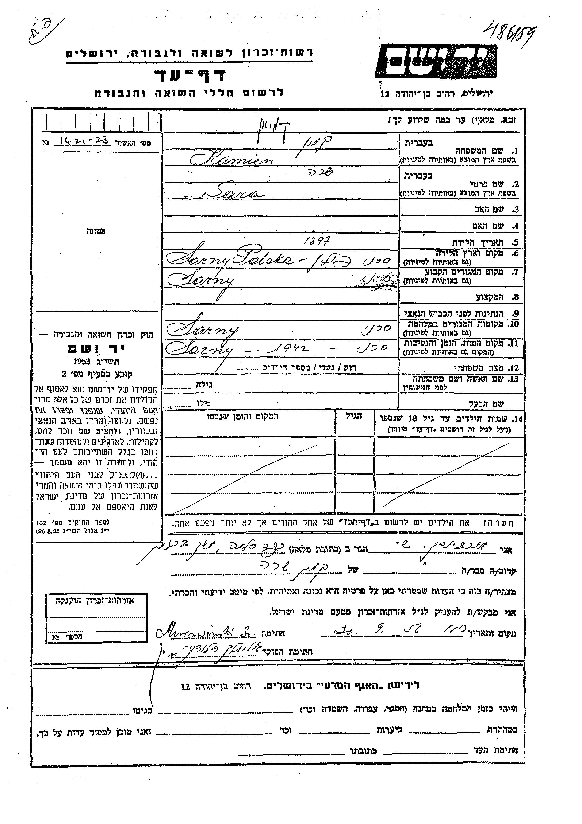 שרה נרצחה בשואה. מקום המוות: Sarny שבפולין בשנת 1942.