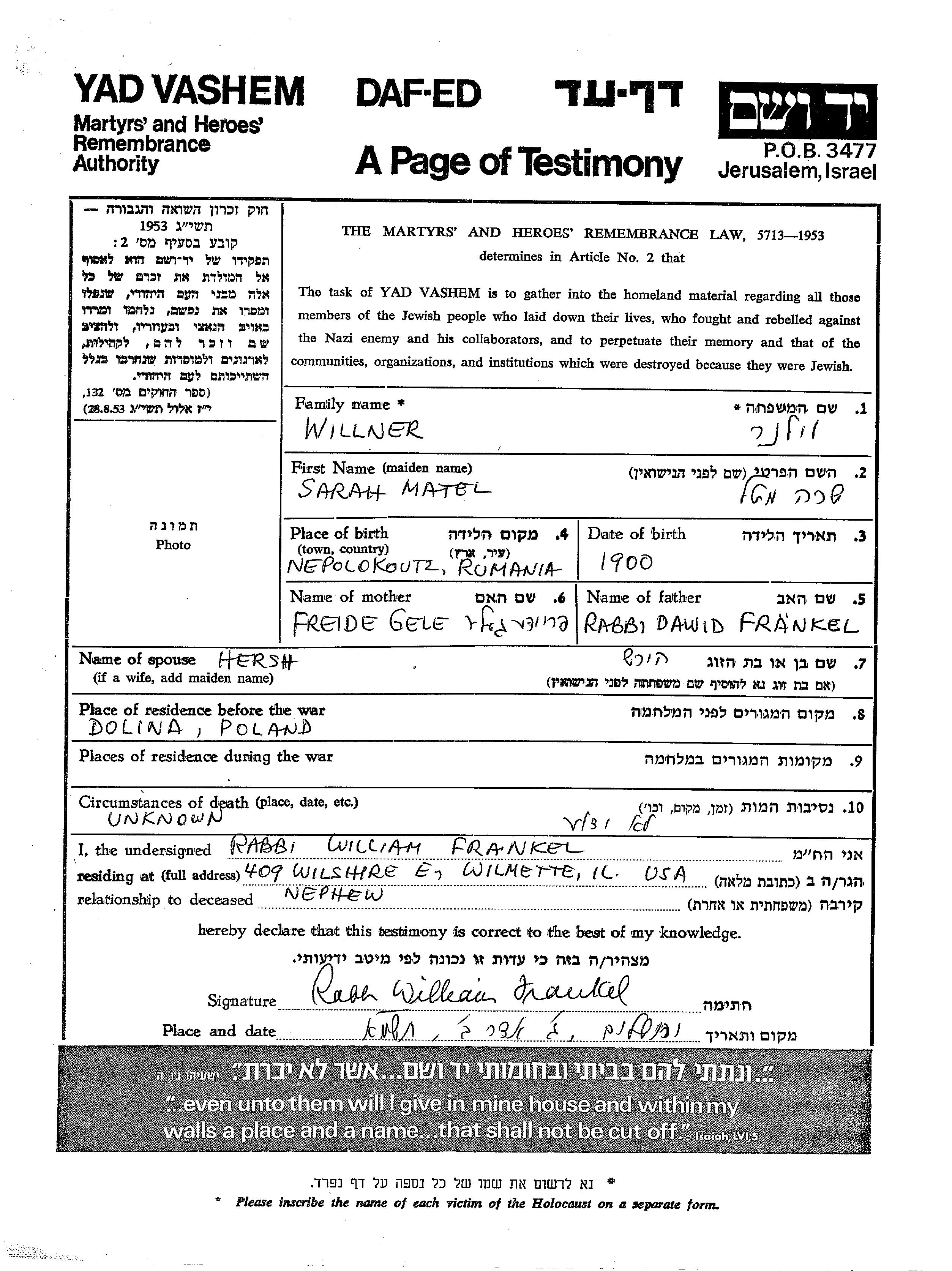 Sarah Matel מטל Willner לבית פרנקל נולדה בNepolokovtsy שברומניה בשנת 1900 לDawid ופריידה Gele. היא היתה נשואה לHersh. לפני מלחמת העולם השניה התגוררה בDolina שבפולין.