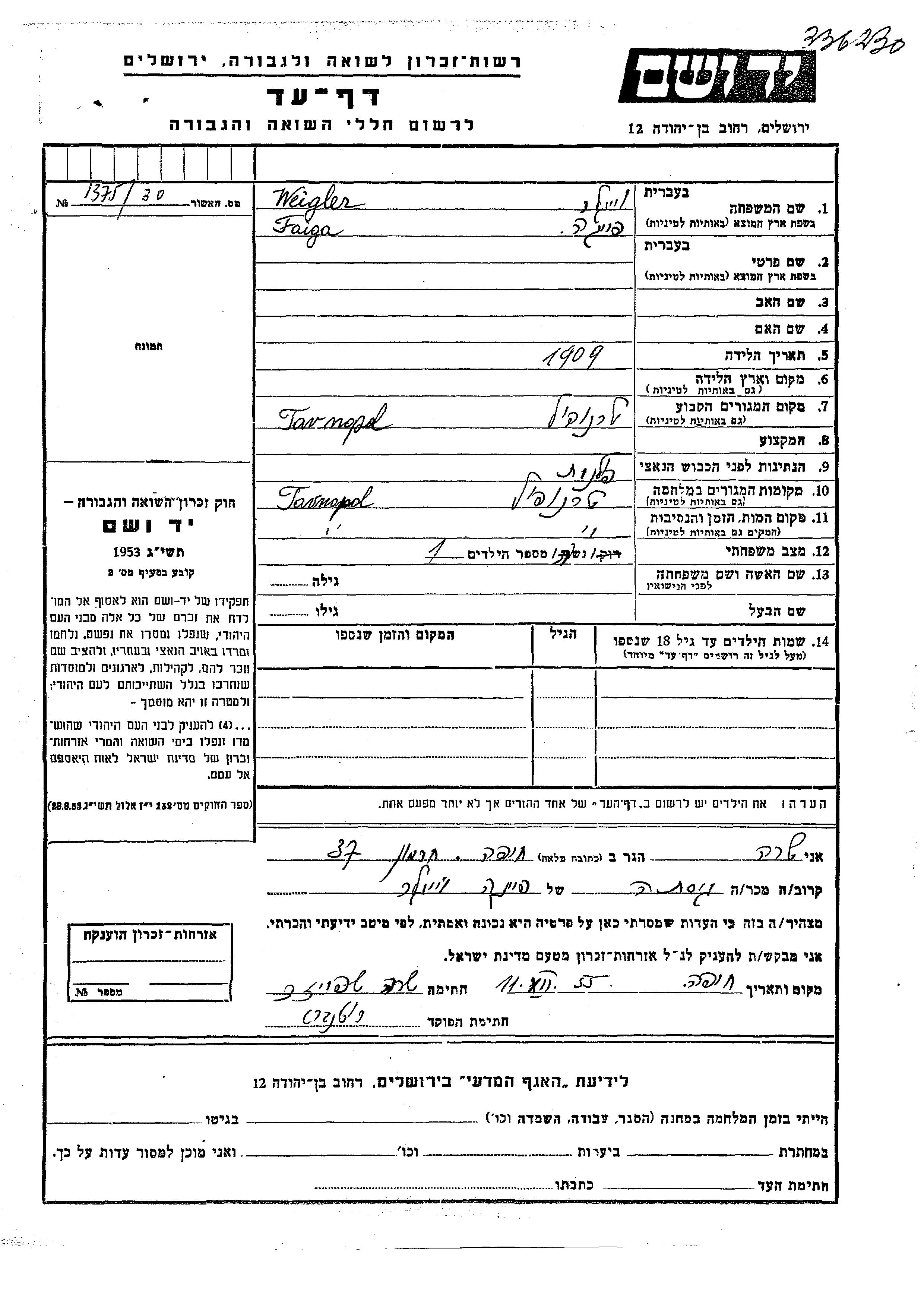 Faiga Weigler נולדה בשנת 1909. היא היתה נשואה. לפני מלחמת העולם השניה התגוררה בTarnopol שבפולין. בזמן המלחמה היא היתה בTarnopol שבפולין. היא נרצחה בשואה. מקום המוות: Tarnopol שבפולין.