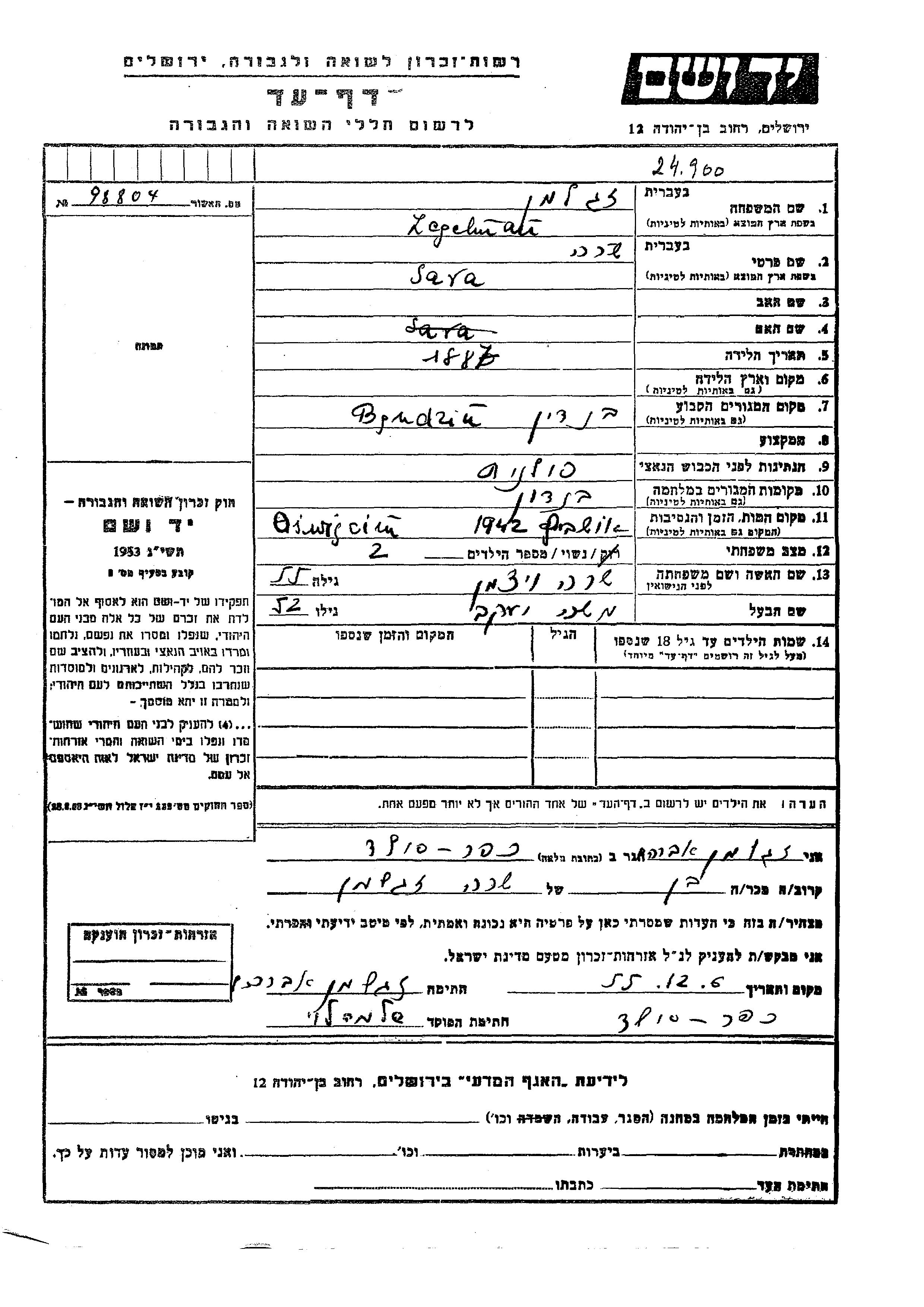 שרה זגלמן לבית ויצמן נולדה בשנת 1887. היא היתה נשואה למשה יעקב. לפני מלחמת העולם השניה התגוררה בBendzin שבפולין. בזמן המלחמה היא היתה בBendzin שבפולין. שרה נרצחה בשואה. מקום המוות: Auschwitz שבפולין בשנת 1942.