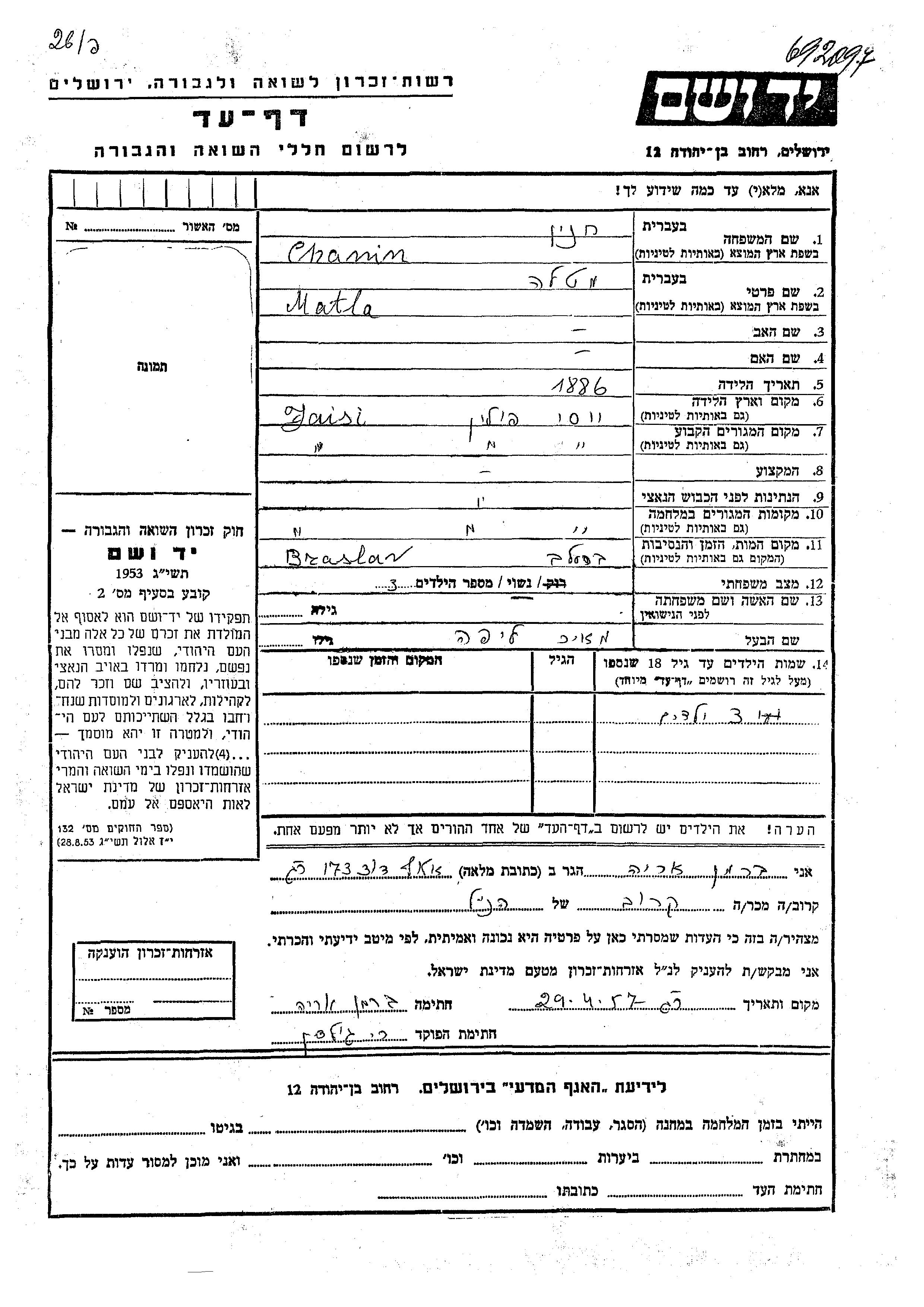 יד ושם - המפעל להנצחת השמות בדפי עד