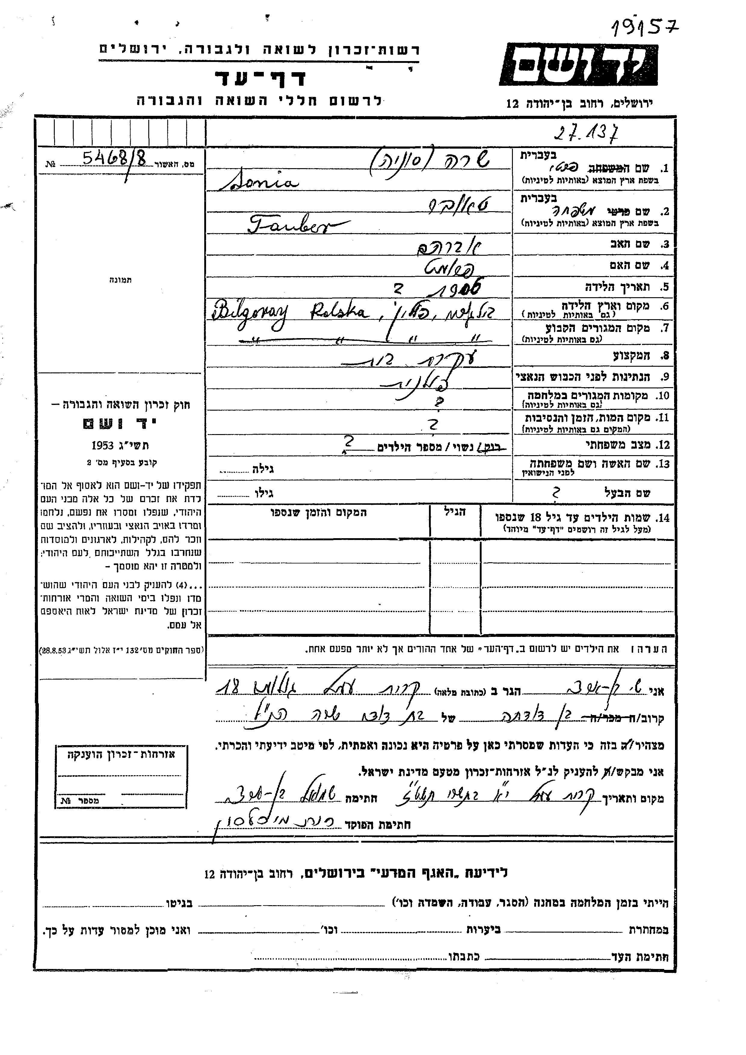 שרה סוניה טאובר נולדה בBilgoray שבפולין בשנת 1906 לאברהם ופרומט. היא היתה עקרת בית ונשואה. לפני מלחמת העולם השניה התגוררה בBilgoray שבפולין. שרה סוניה נרצחה בשואה.