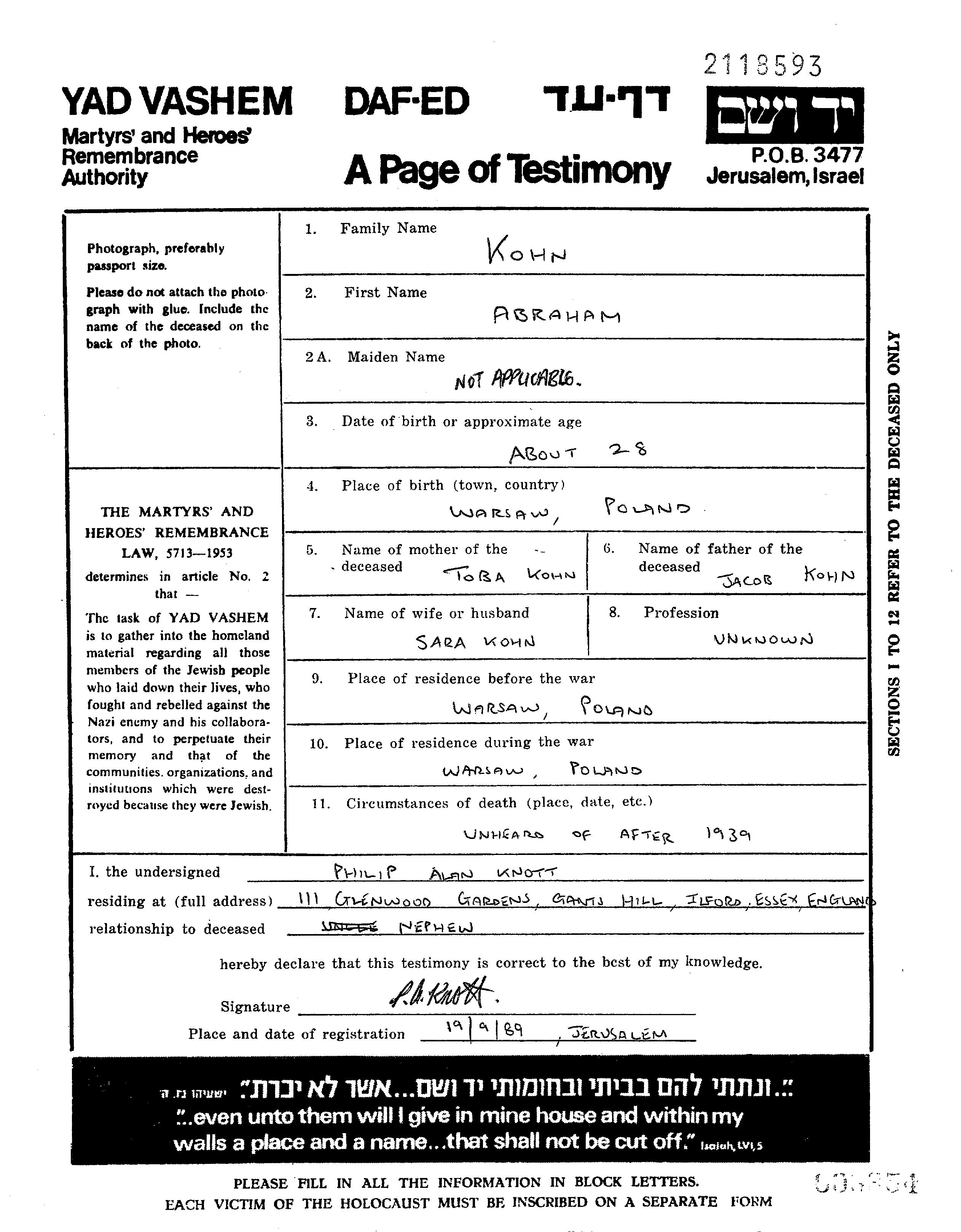 Abraham Kohn קון נולד בWarszawa שבפולין לJacob וToba טובה. הוא היה נשוי לשרה. לפני מלחמת העולם השניה התגורר בWarszawa שבפולין. בזמן המלחמה הוא היה בWarszawa שבפולין. הוא נרצח בשואה.