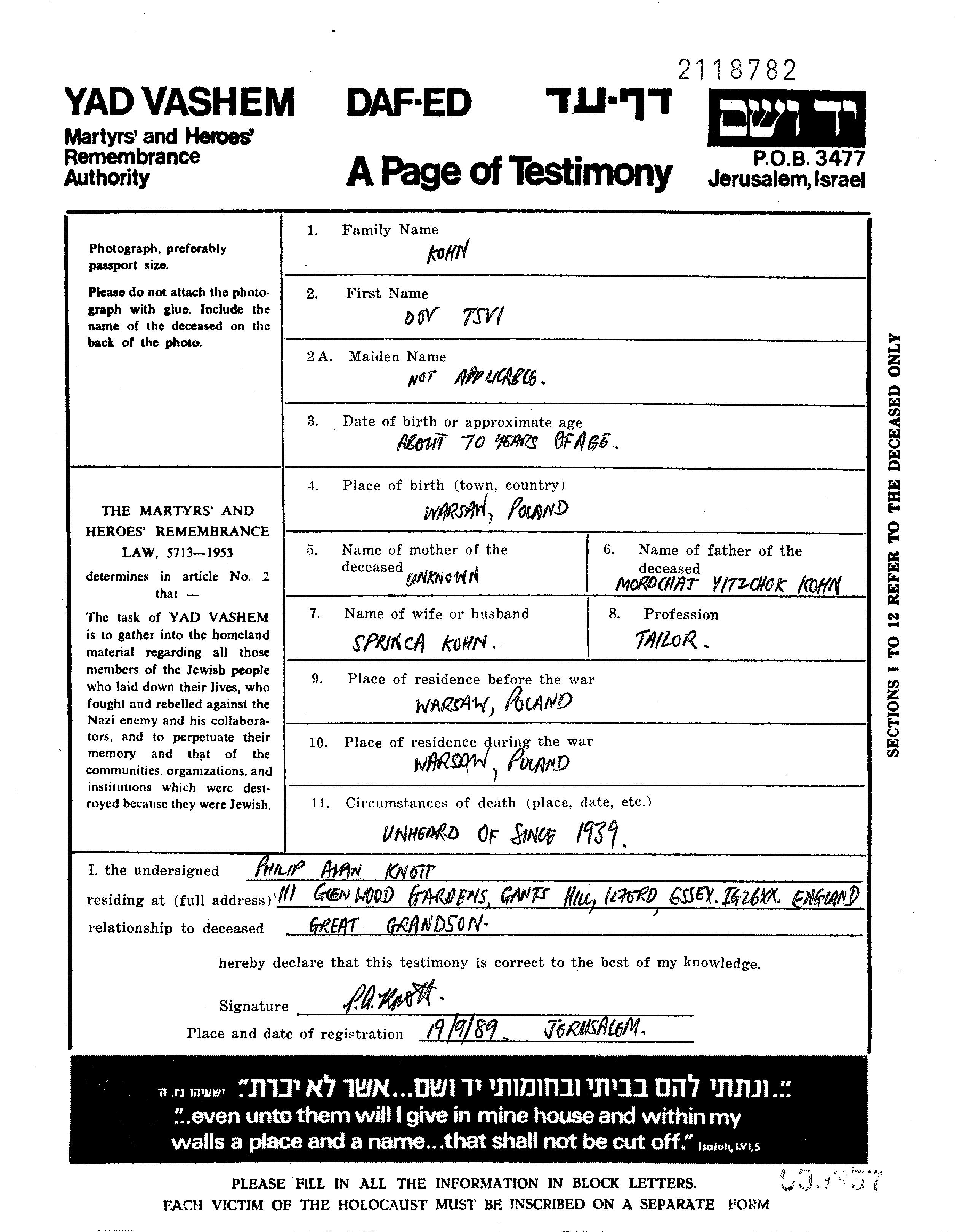 Tsvi דב Kohn קון נולד בWarszawa שבפולין בשנת 1893 לMordchaj Yitzchok. הוא היה חייט ונשוי לSprinca. לפני מלחמת העולם השניה התגורר בWarszawa שבפולין. בזמן המלחמה הוא היה בWarszawa שבפולין.