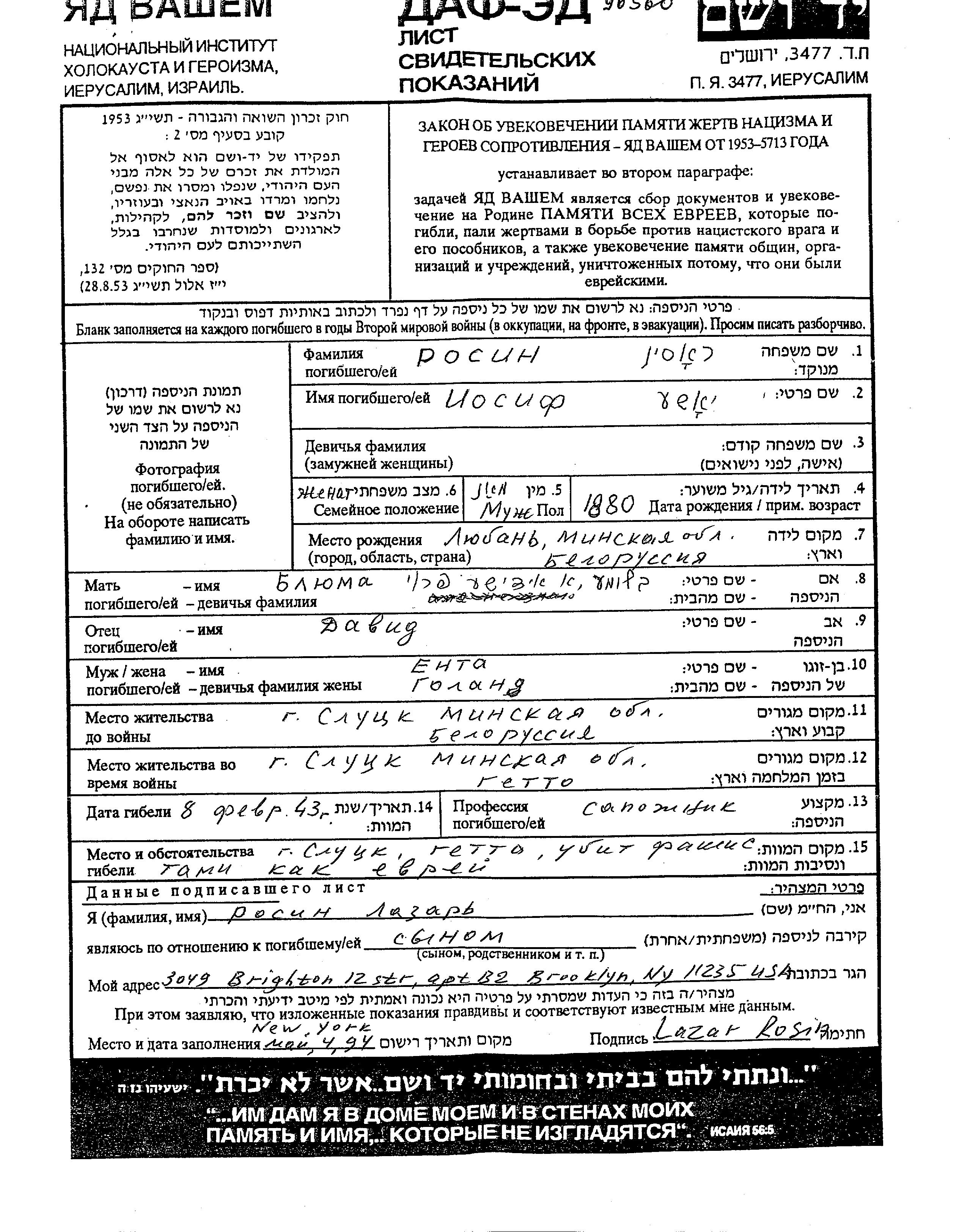 Iosif Rosin רוסין נולד בLyuban שבביאלורוסיה (ברה"מ) בשנת 1880 לדוד וBlyuma. הוא היה סנדלר ונשוי לינטה. לפני מלחמת העולם השניה התגורר בSlutsk שבביאלורוסיה (ברה"מ). בזמן המלחמה הוא היה בSlutsk שבביאלורוסיה (ברה"מ). הוא נרצח בשואה. מקום המוות: Slutsk שבביאלורוסיה (ברה"מ) בשנת 1943.