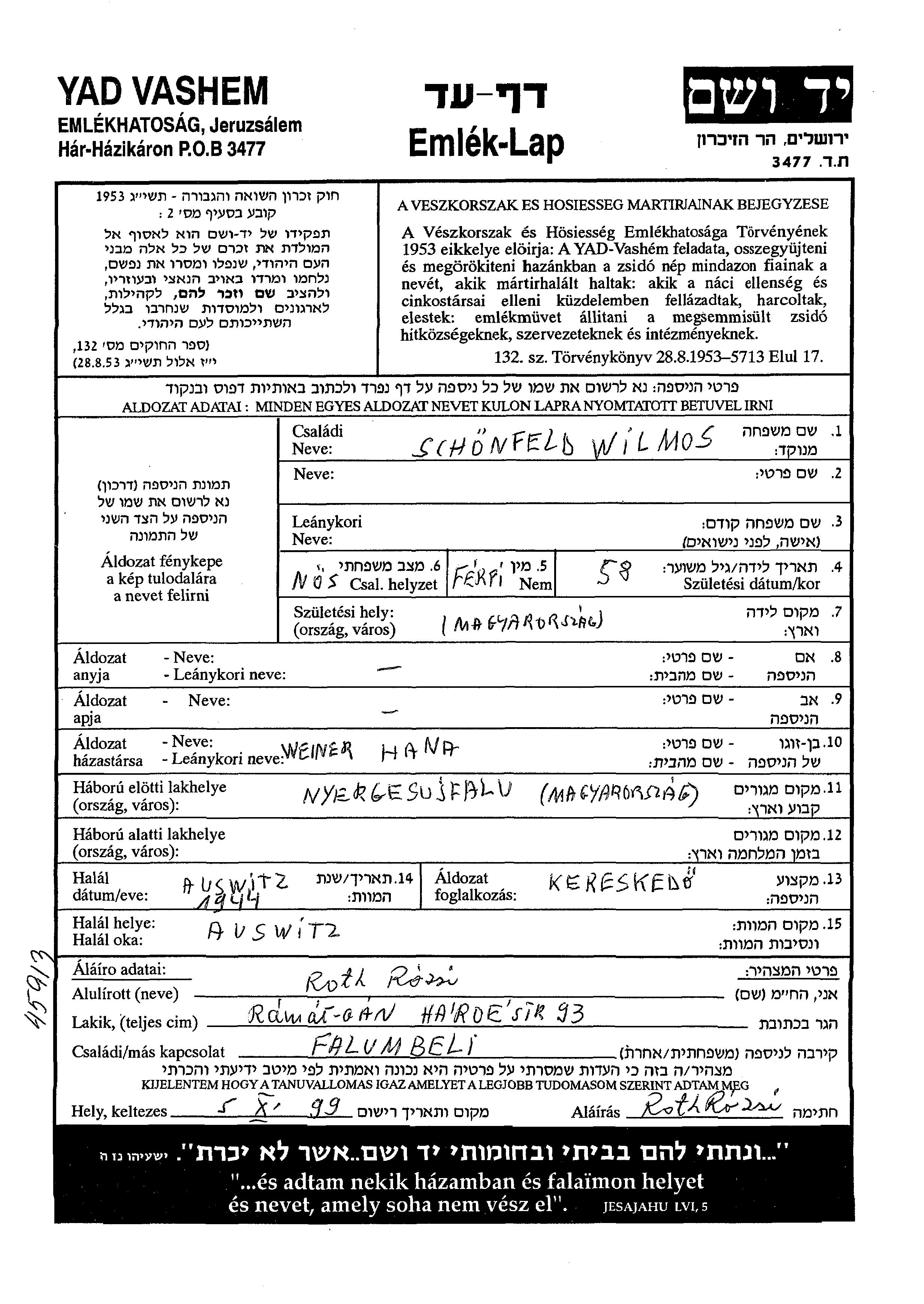 Wilmos Schonfeld נולד בהונגריה. הוא היה סוחר ונשוי להנה לבית Weiner. לפני מלחמת העולם השניה התגורר בNyergesujfalu שבהונגריה.