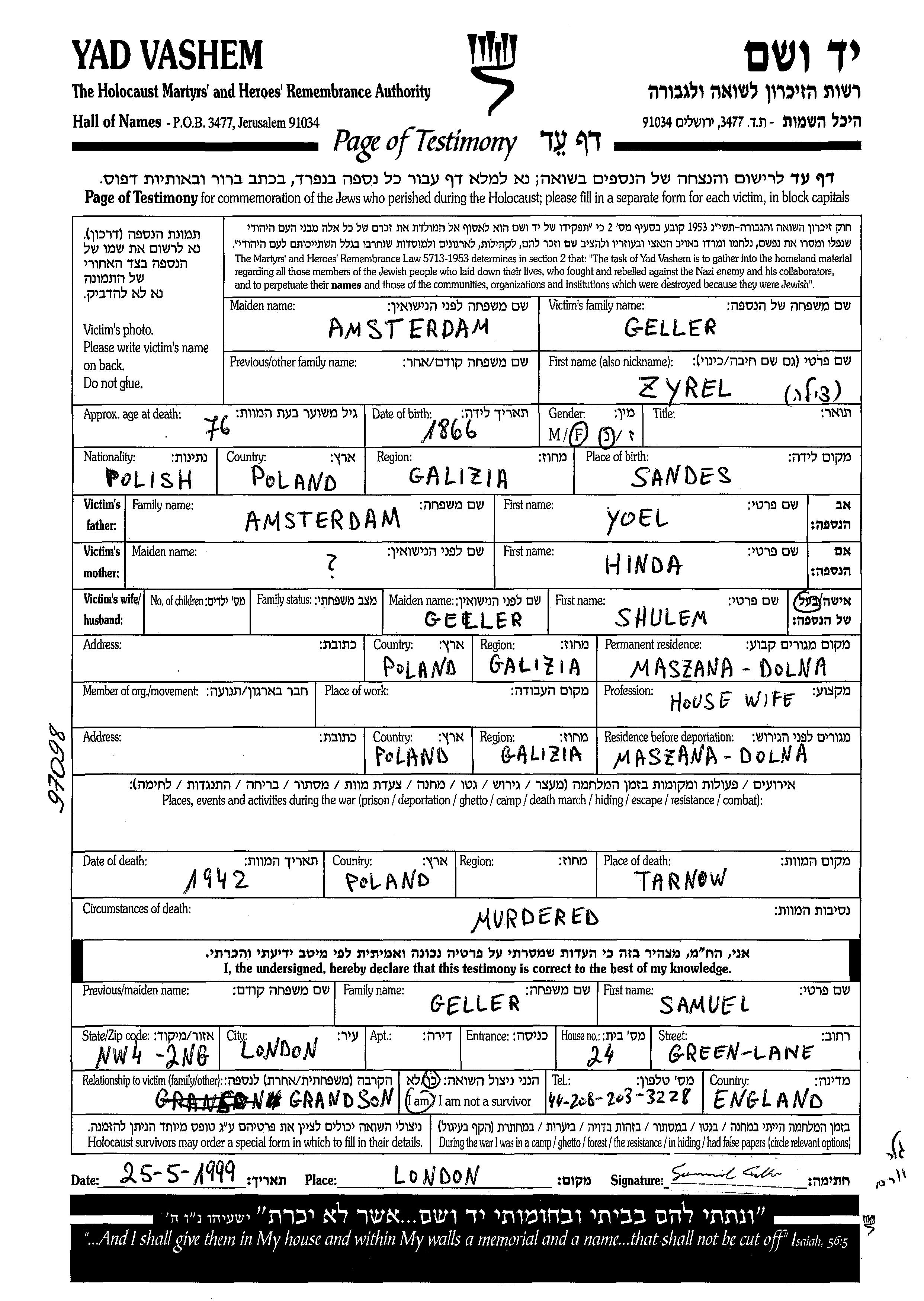 Zyrel צילה Geller לבית אמסטרדם נולדה בSandec שבפולין בשנת 1866 ליואל והינדה. היא היתה עקרת בית ונשואה לShulem. לפני מלחמת העולם השניה התגוררה בMszana Dolna שבפולין. בזמן המלחמה היא היתה בMszana Dolna שבפולין.