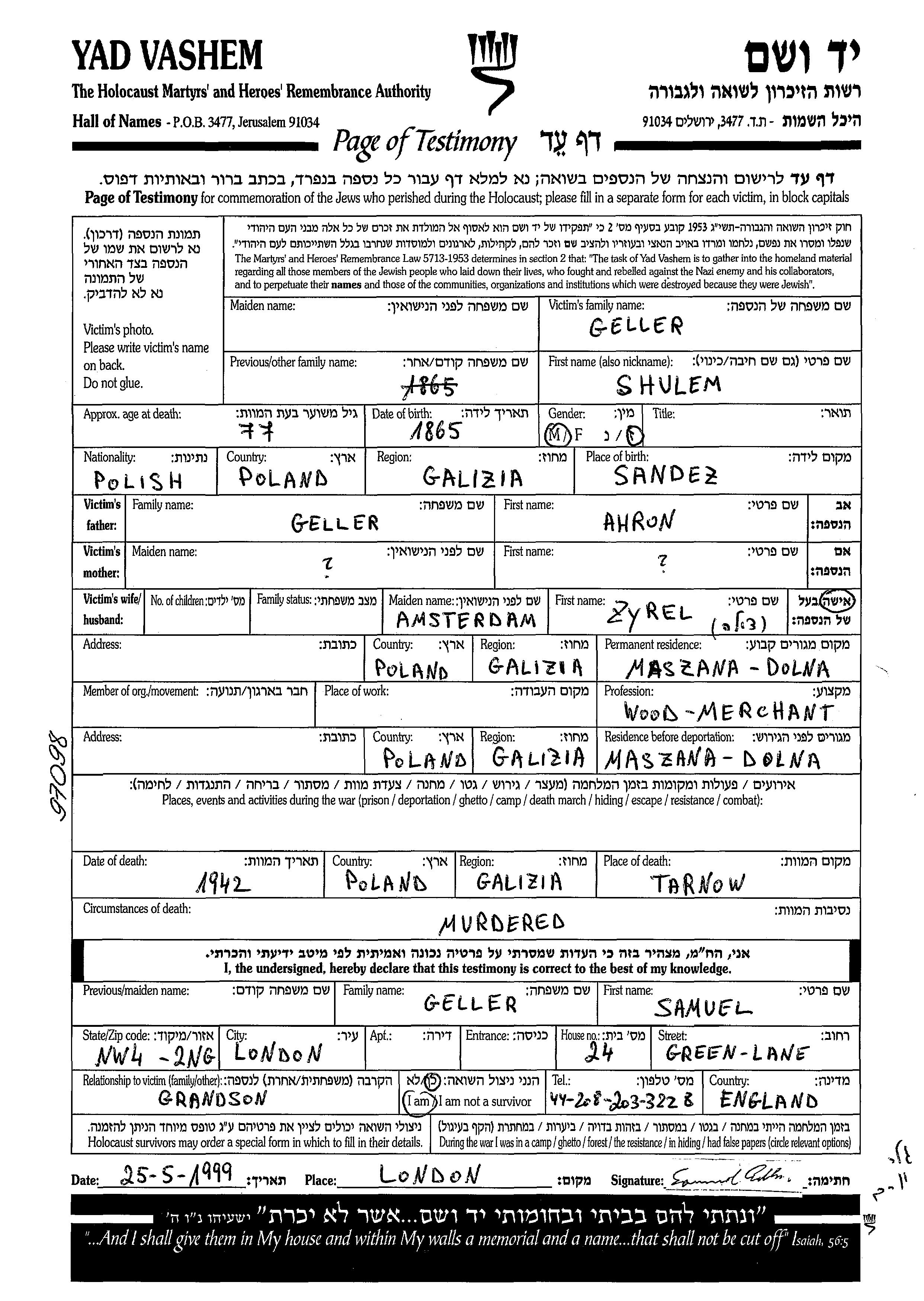 Shulem Geller נולד בSandets שבפולין בשנת 1865 לAhron. הוא היה סוחר עצים ונשוי לZyrel צילה לבית אמסטרדם. לפני מלחמת העולם השניה התגורר בMszana Dolna שבפולין. בזמן המלחמה הוא היה בMszana Dolna שבפולין.