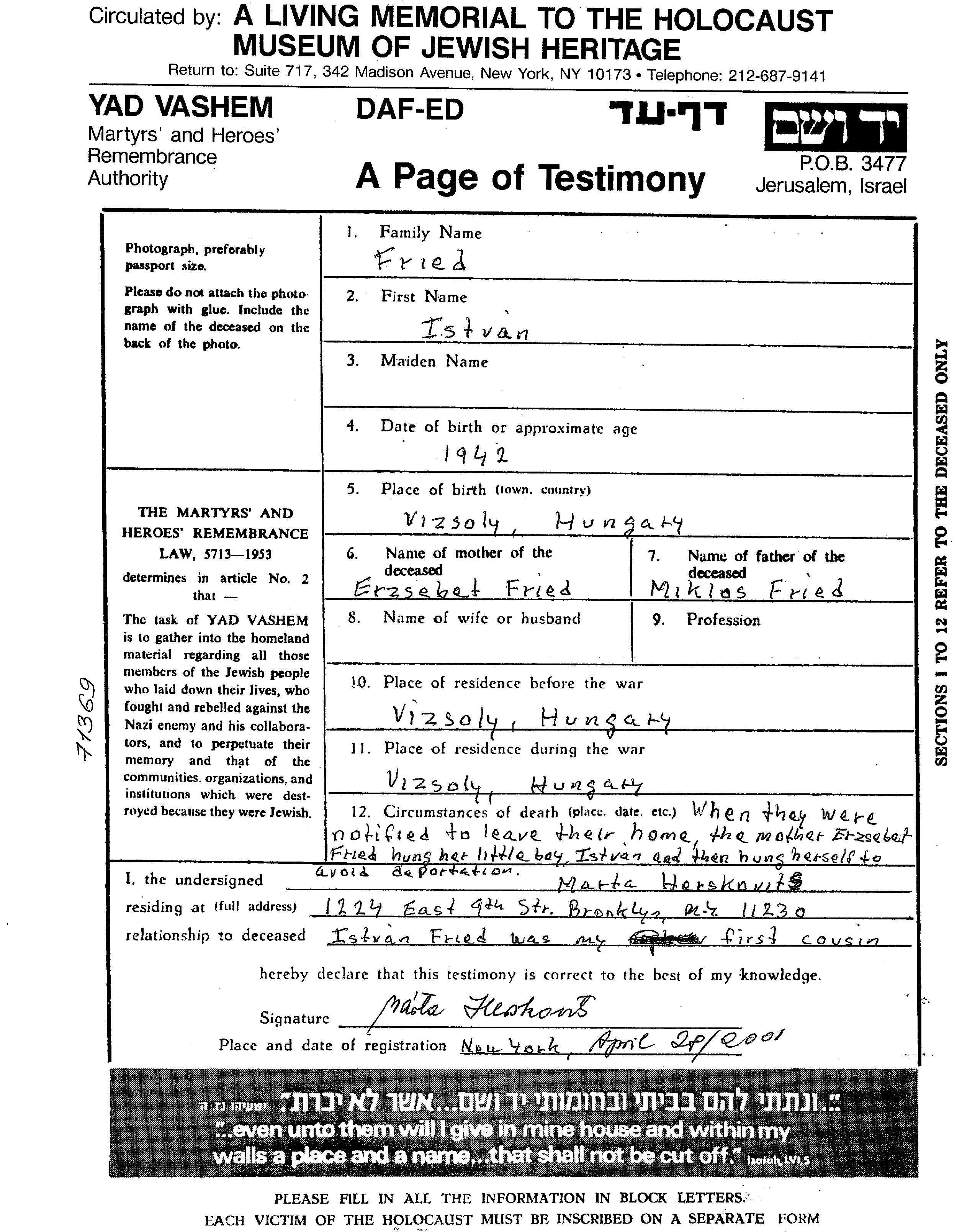 אישטוון Fried נולד בVizsoly שבהונגריה בשנת 1942 לMiklos וErzsebet. הוא היה ילד. לפני מלחמת העולם השניה התגורר בVizsoly שבהונגריה. בזמן המלחמה הוא היה בVizsoly שבהונגריה. אישטוון נרצח בשואה. מקום המוות: Vizsoly שבהונגריה.