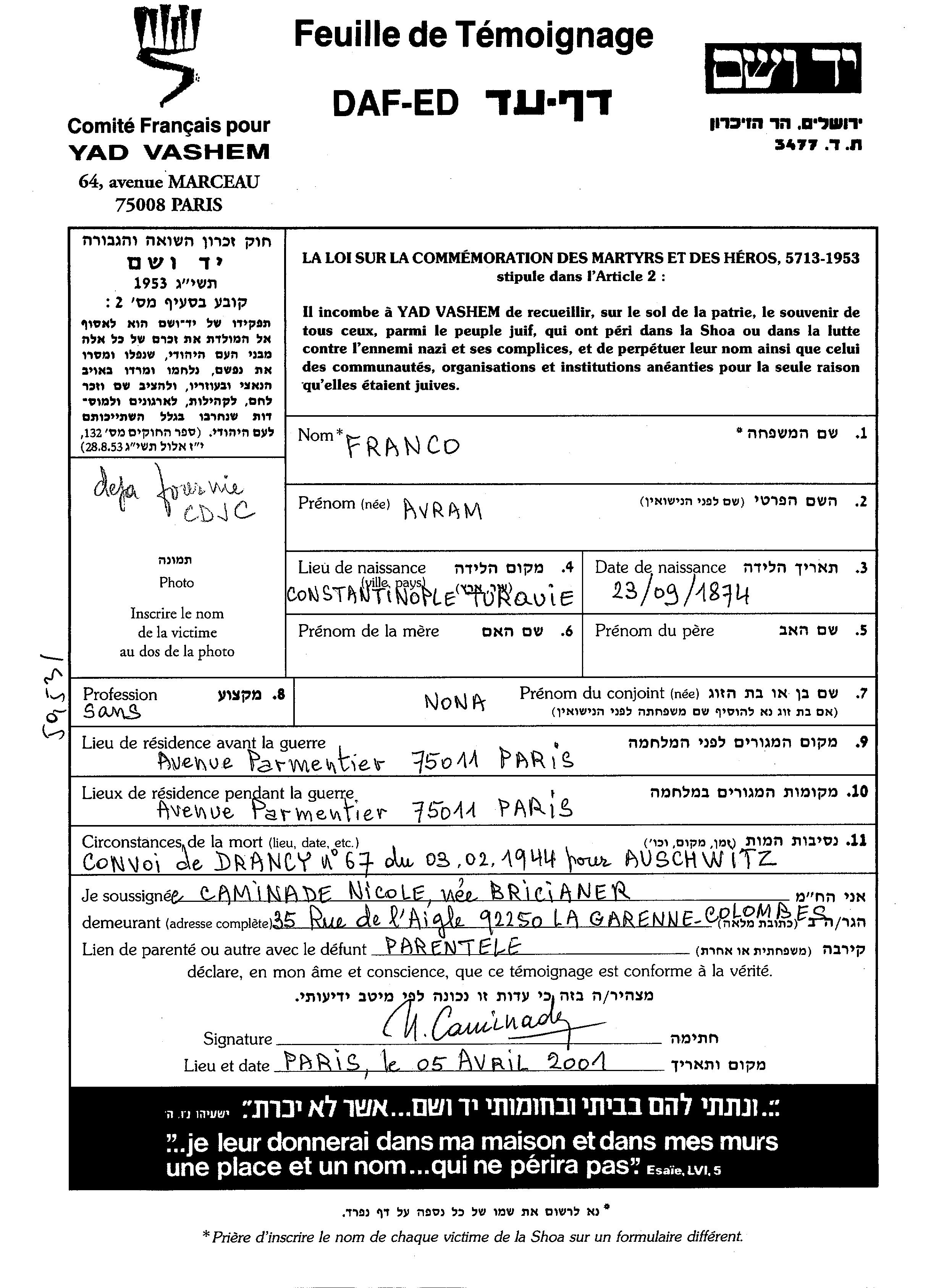 Avram Franco נולד בConstantinople שבטורקיה בשנת 1874. לפני מלחמת העולם השניה התגורר בParis שבצרפת. בזמן המלחמה הוא היה בParis שבצרפת. הוא נרצח בשואה. מקום המוות: Auschwitz שבפולין בשנת 1944.