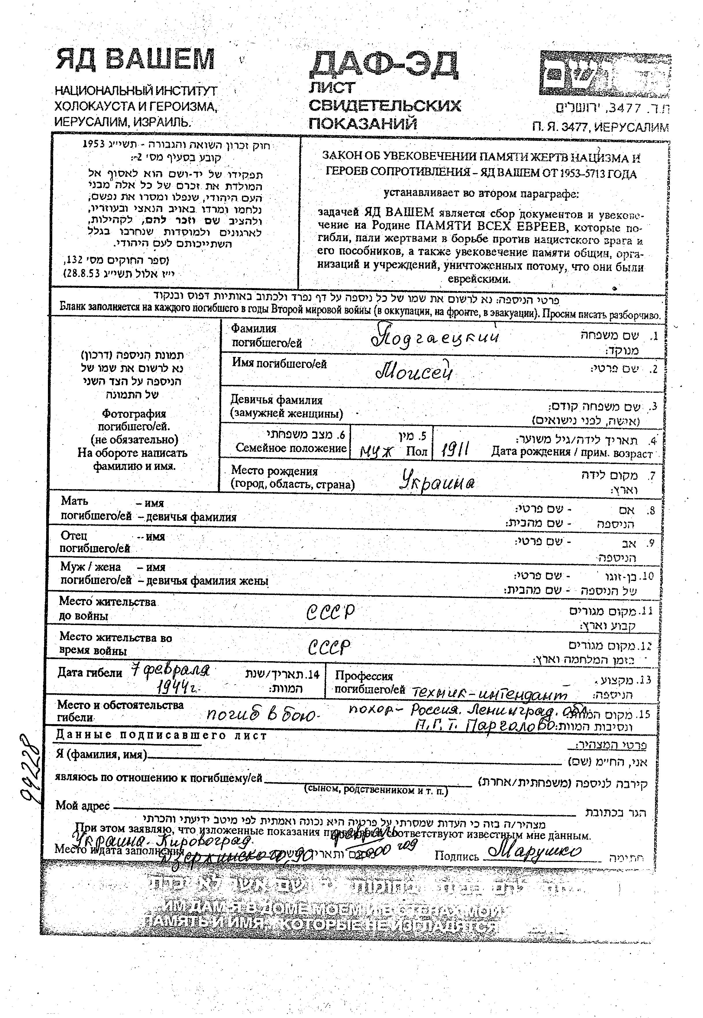 קצין זוטר בחיל התחזוקה Moisey Podgayetzki נולד באוקראינה (ברה"מ) בשנת 1911. הוא היה קצין תחזוקה. לפני מלחמת העולם השניה התגורר בברית המועצות. בזמן המלחמה הוא היה בברית המועצות. קצין זוטר בחיל התחזוקה Podgayetzki נהרג בשירות צבאי. מקום המוות: Pargolovo שברוסיה (ברה"מ) בשנת 1944.