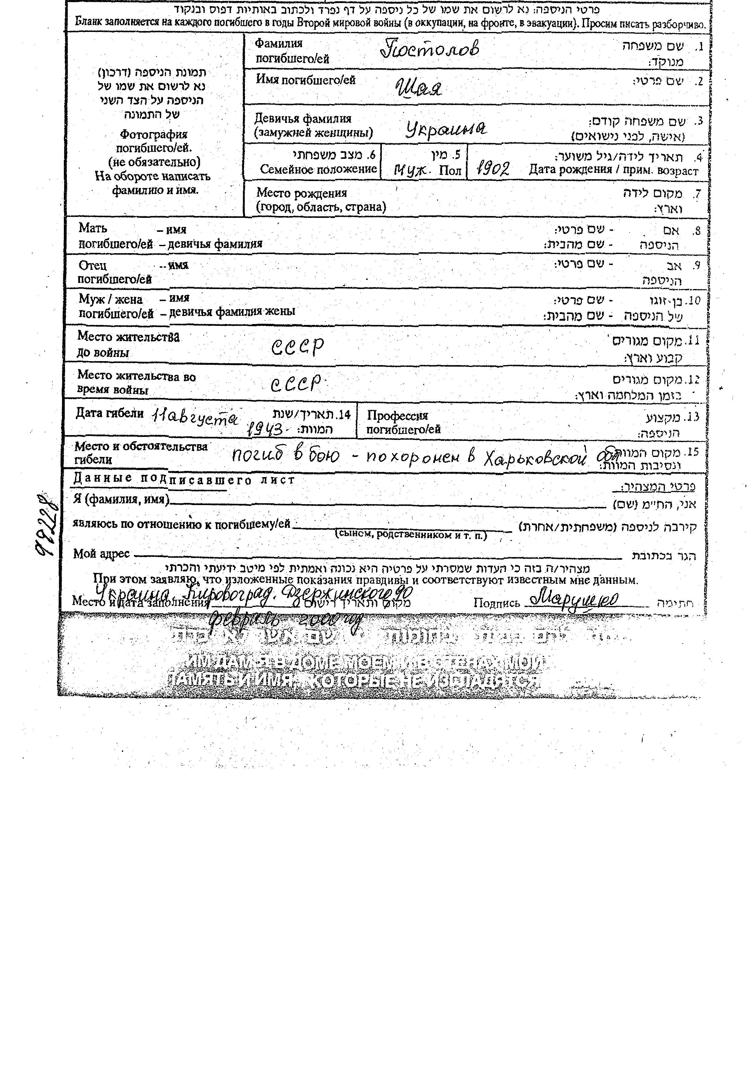 Shaya פוסטולוב נולד באוקראינה (ברה"מ) בשנת 1902. לפני מלחמת העולם השניה התגורר בברית המועצות. בזמן המלחמה הוא היה בצבא הסובייטי.
