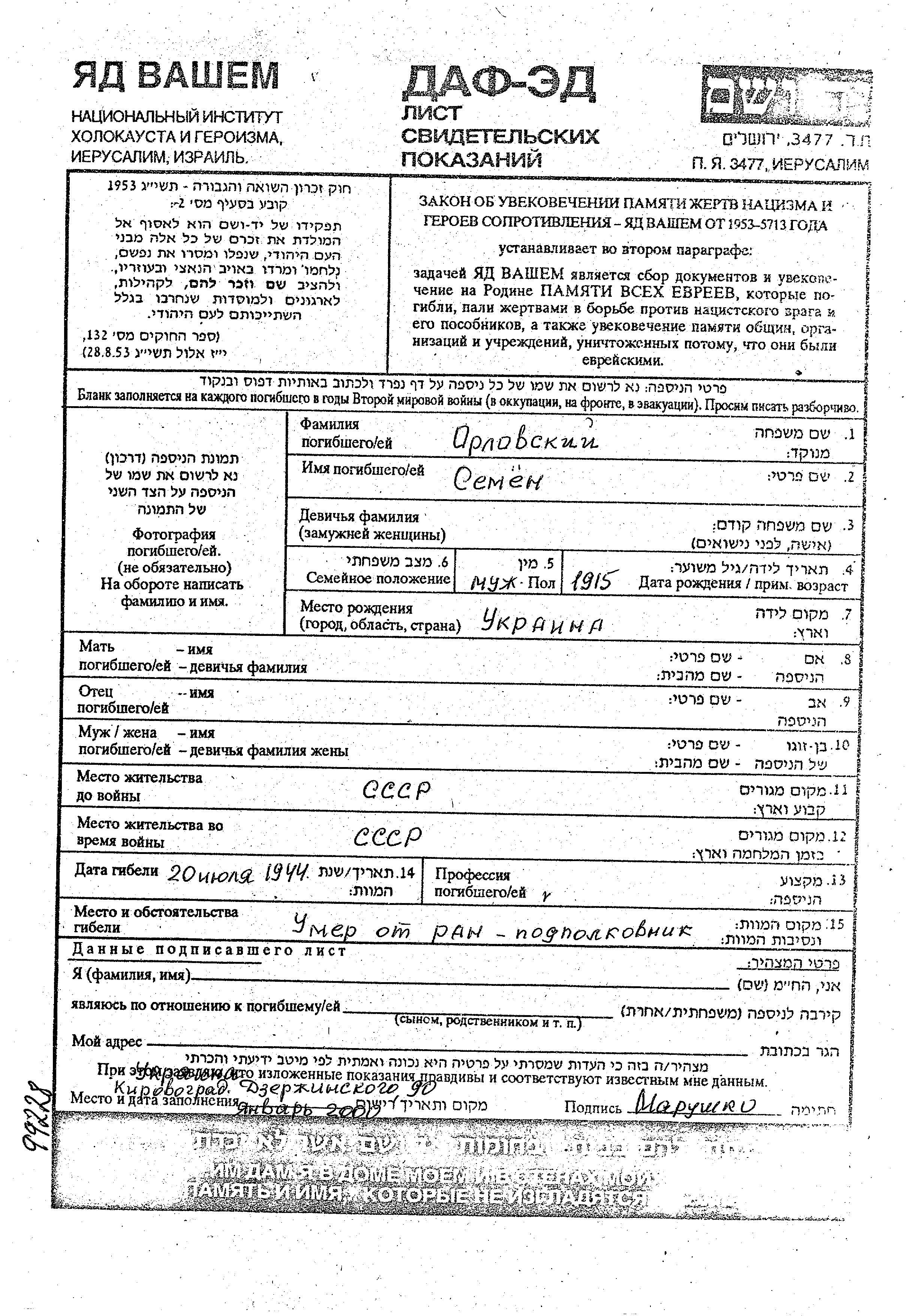 Semyon אורלובסקי נולד באוקראינה (ברה"מ) בשנת 1915. הוא היה איש צבא. לפני מלחמת העולם השניה התגורר בברית המועצות. בזמן המלחמה הוא היה בברית המועצות. הוא נרצח בשואה. מקום המוות: לא ידוע בשנת 1944.