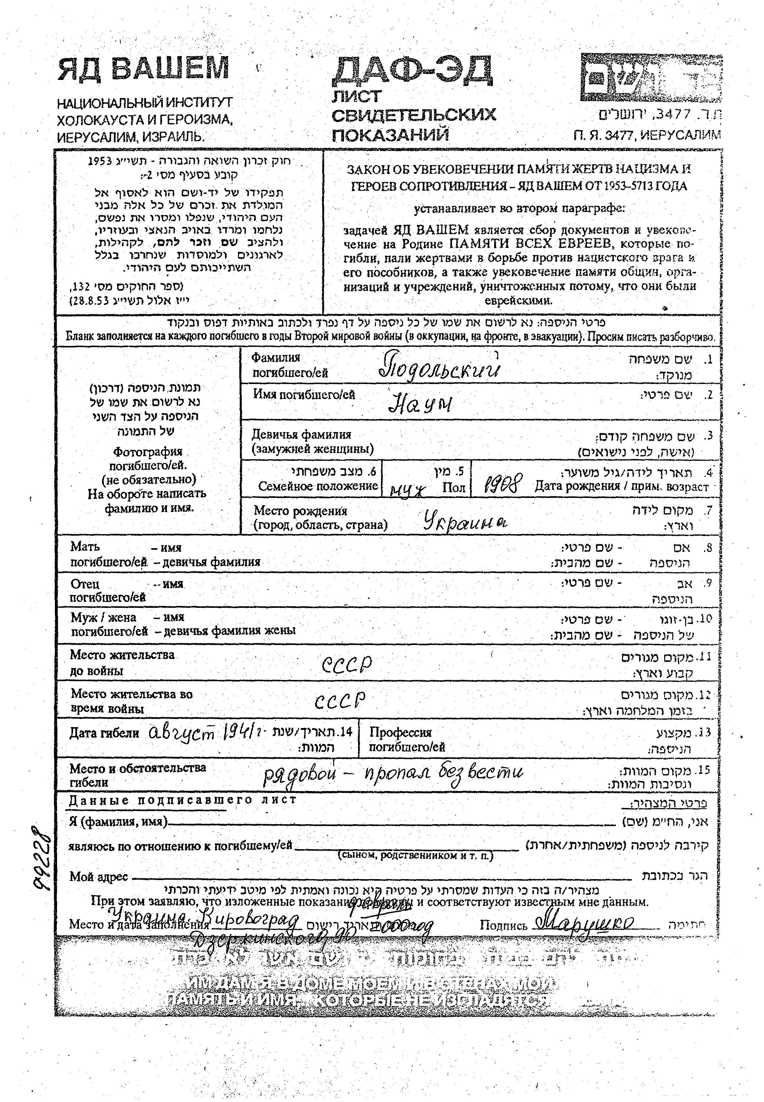 נאום נרצח בשואה. מקום המוות: לא ידוע בשנת 1941.