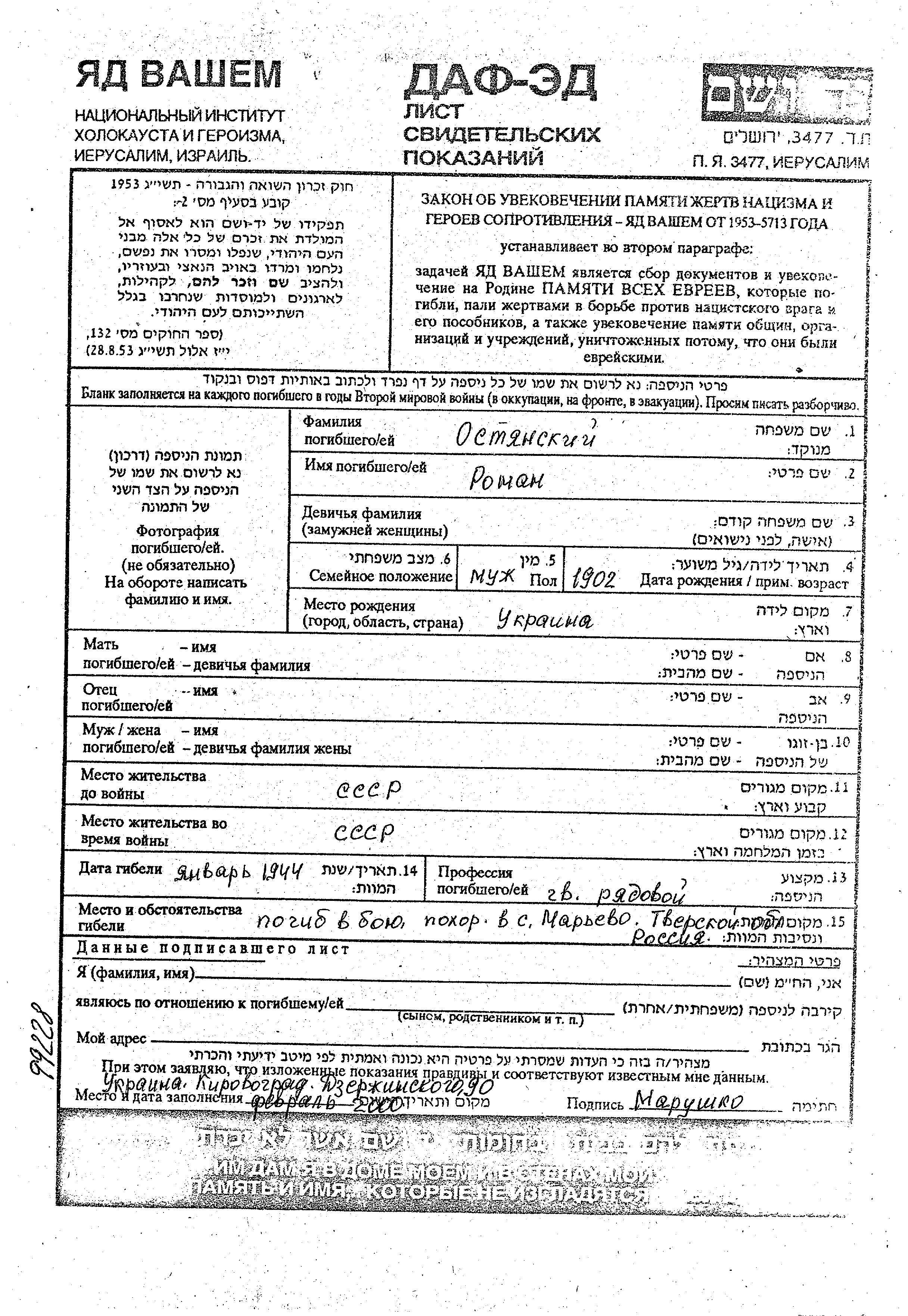 רומן Ostyanski נולד בKirovograd שבאוקראינה (ברה"מ) בשנת 1902. לפני מלחמת העולם השניה התגורר בKirovograd שבאוקראינה (ברה"מ). בזמן המלחמה הוא היה בצבא הסובייטי.