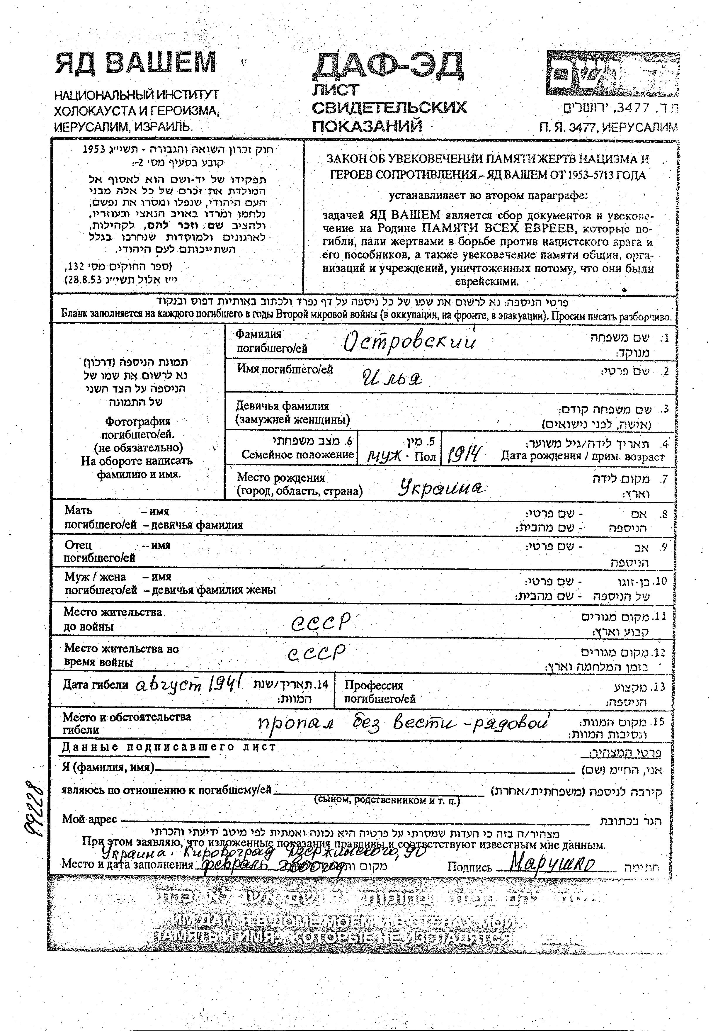 איליה אוסטרובסקי נולד באוקראינה (ברה"מ) בשנת 1914. לפני מלחמת העולם השניה התגורר בברית המועצות. בזמן המלחמה הוא היה בברית המועצות. איליה נרצח בשואה. מקום המוות: לא ידוע בשנת 1941.