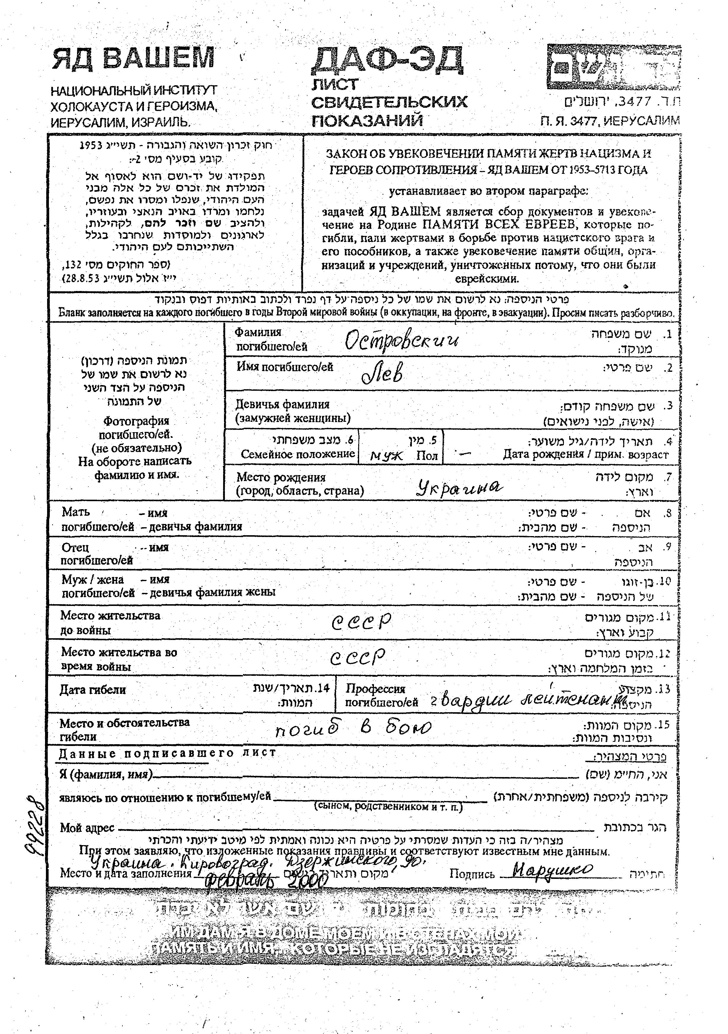 לב אוסטרובסקי נולד באוקראינה (ברה"מ). הוא היה קצין. לפני מלחמת העולם השניה התגורר בברית המועצות. בזמן המלחמה הוא היה בצבא הסובייטי.