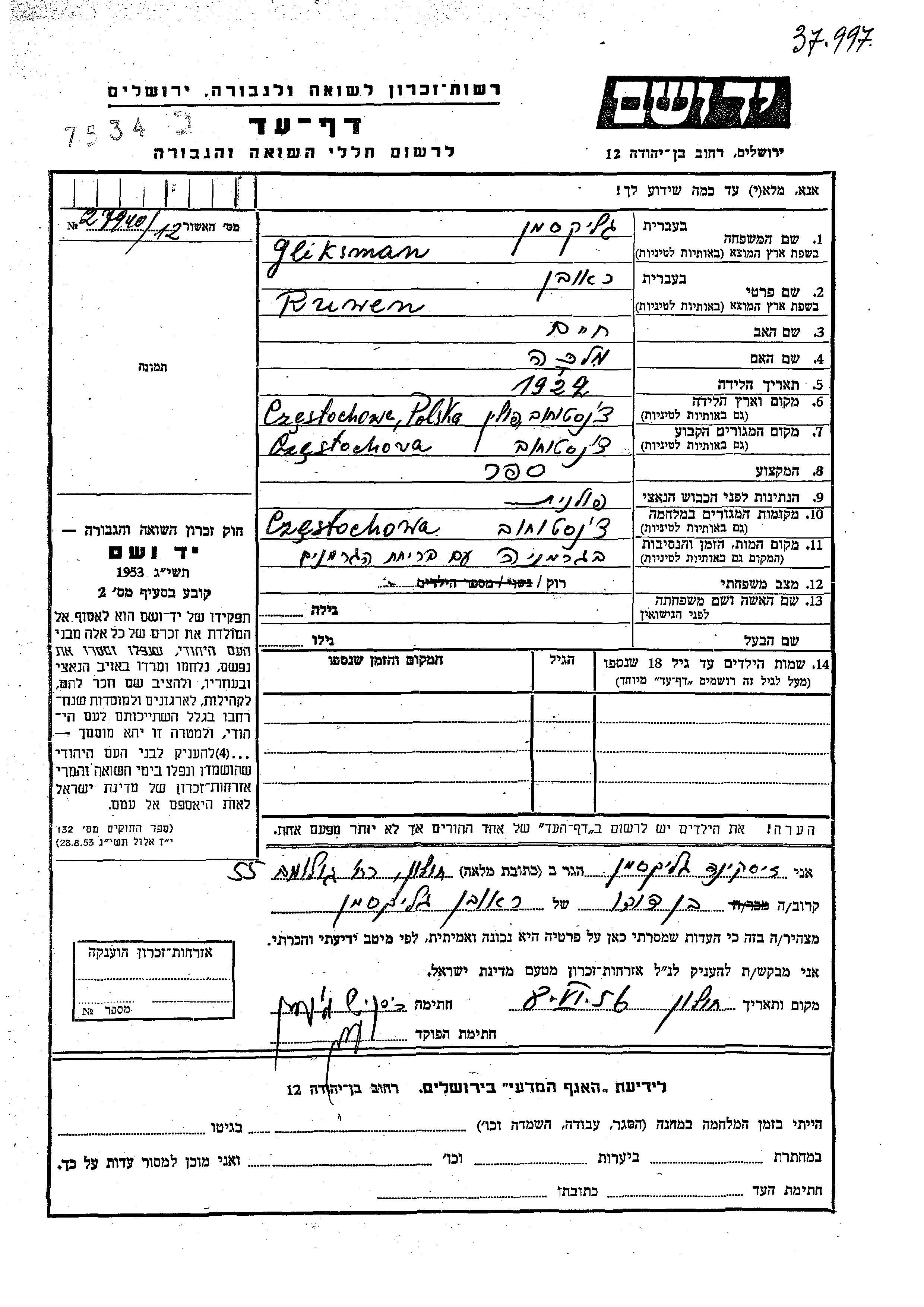 Ruwen גליקסמן נולד בCzestochowa שבפולין בשנת 1922 לחיים ומלכה. הוא היה ספר ורווק. לפני מלחמת העולם השניה התגורר בCzestochowa שבפולין. בזמן המלחמה הוא היה בCzestochowa שבפולין. הוא נרצח בשואה.