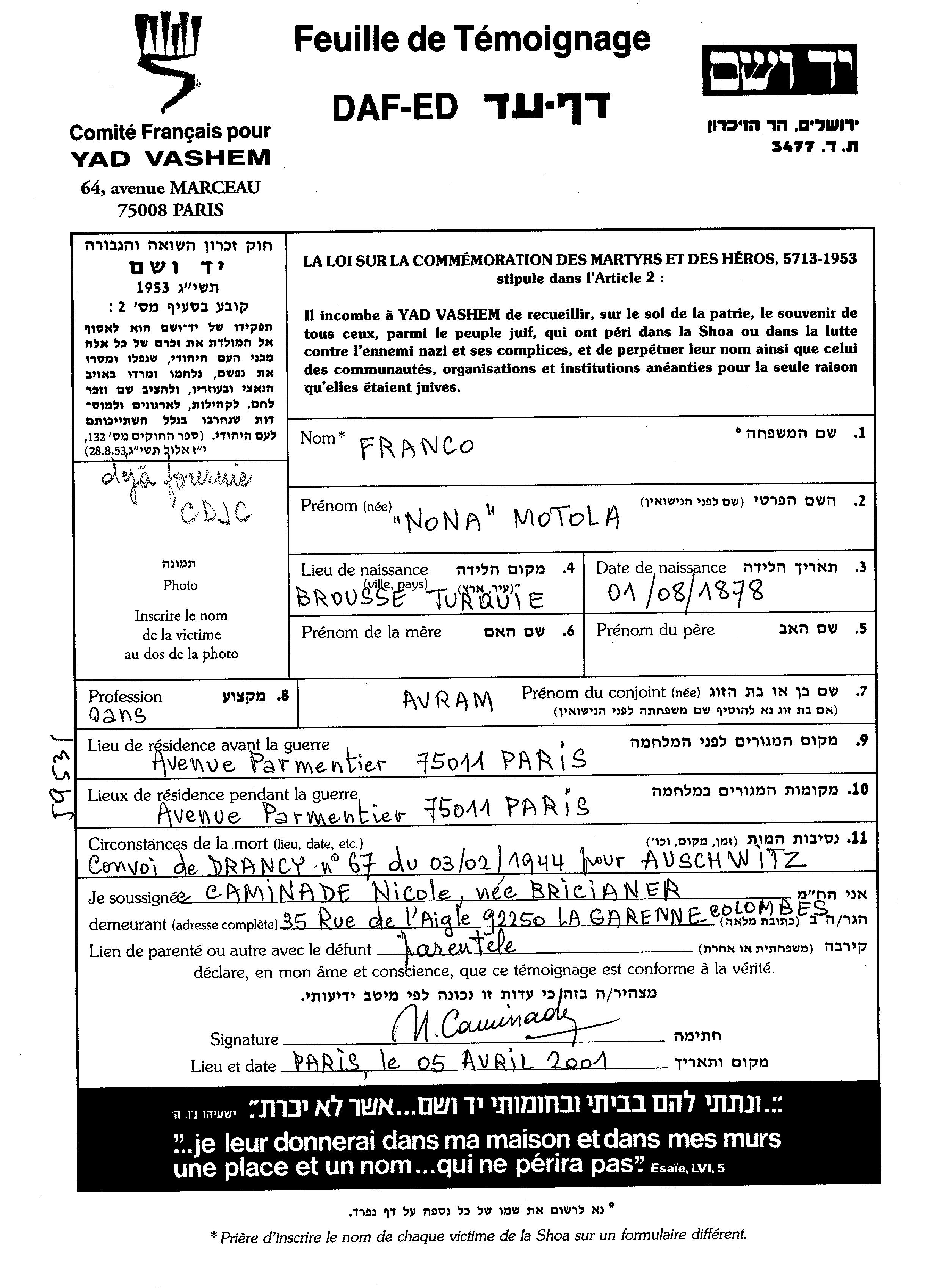 Nona Franco נולדה בBroussa שבטורקיה בשנת 1878. לפני מלחמת העולם השניה התגוררה בParis שבצרפת. בזמן המלחמה היא היתה בParis שבצרפת.