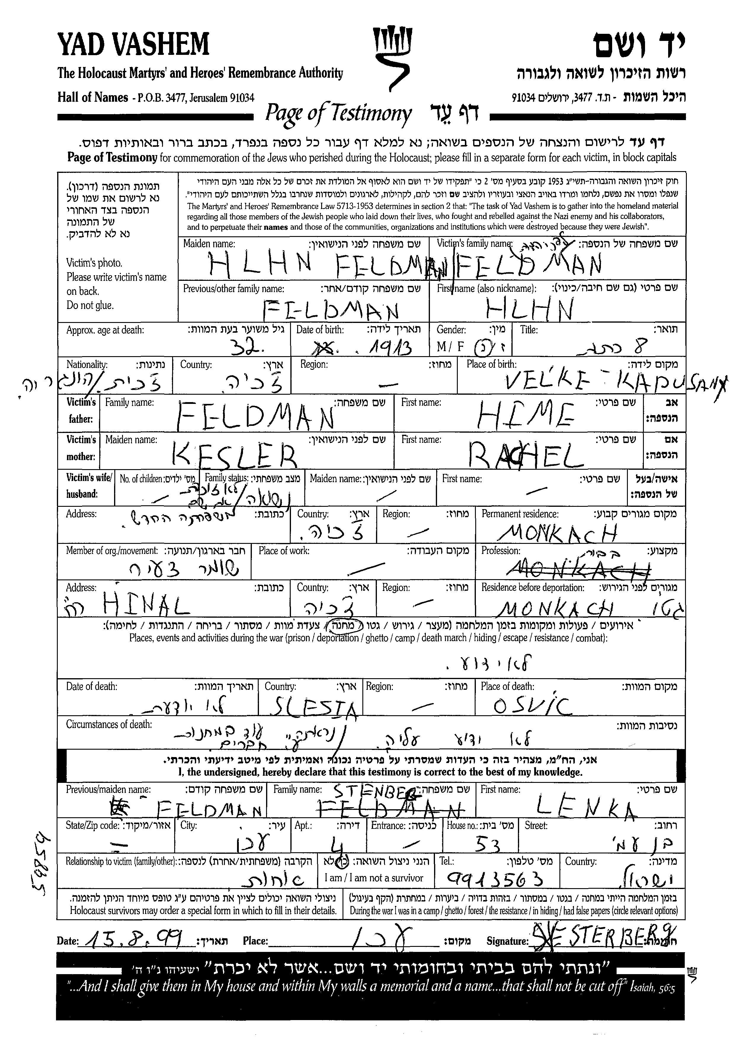 Hlhn שם משפחה לא ידוע לבית פלדמן נולדה בVelke Kapusany שבצ'כוסלובקיה בשנת 1913 לHime ורחל. היא היתה עקרת בית ונשואה. לפני מלחמת העולם השניה התגוררה בMunkacevo שבצ'כוסלובקיה. בזמן המלחמה היא היתה בMunkacs שבצ'כוסלובקיה.