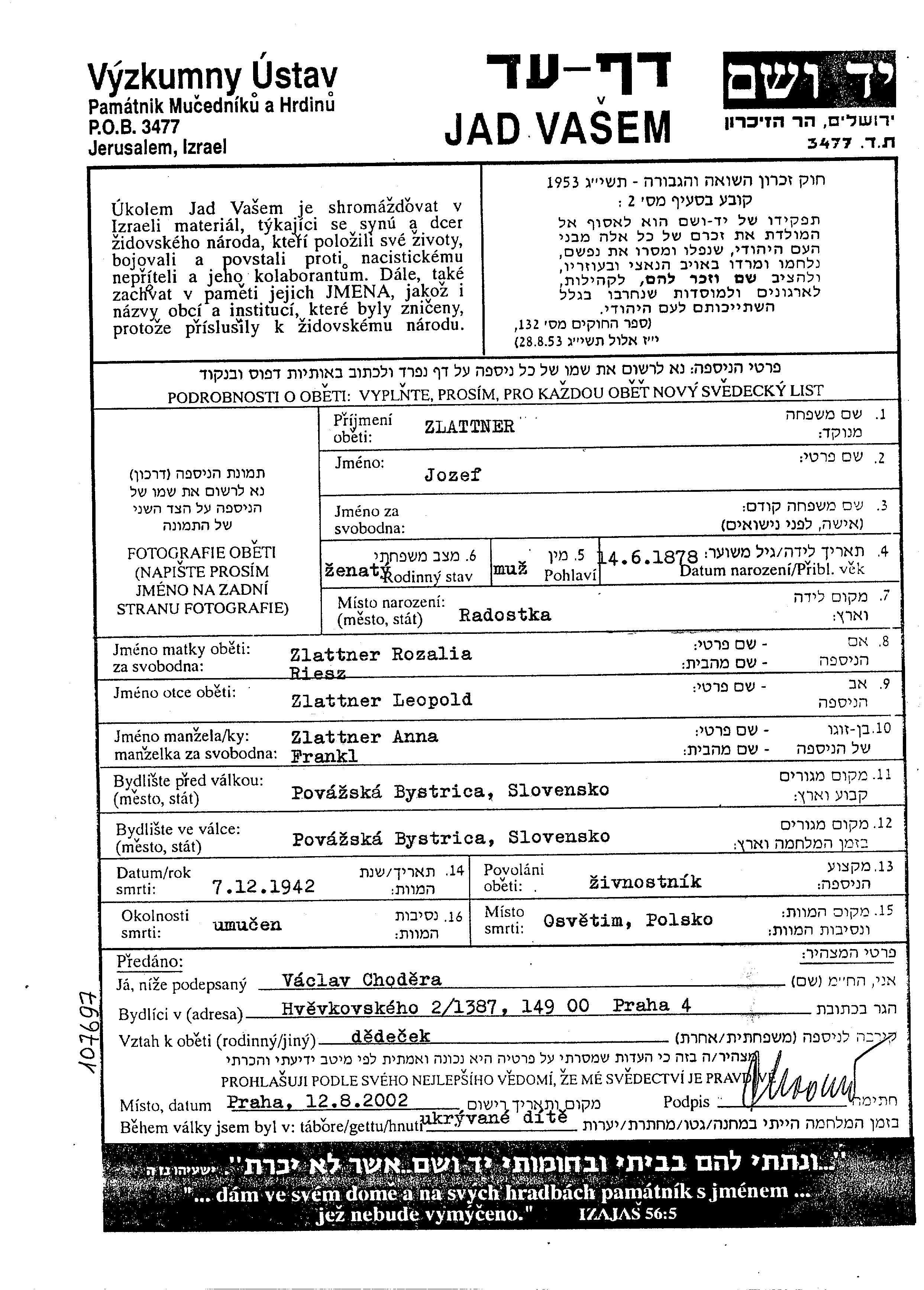 Jozef Zlattner נולד בRadostka שבצ'כוסלובקיה בשנת 1878 ללאופולד ורוזליה לבית Riesz. הוא היה Zivnostnik ונשוי לאנה לבית Frankl. לפני מלחמת העולם השניה התגורר בPovazska Bystrica שבצ'כוסלובקיה. בזמן המלחמה הוא היה בPovazska Bystrica שבצ'כוסלובקיה.