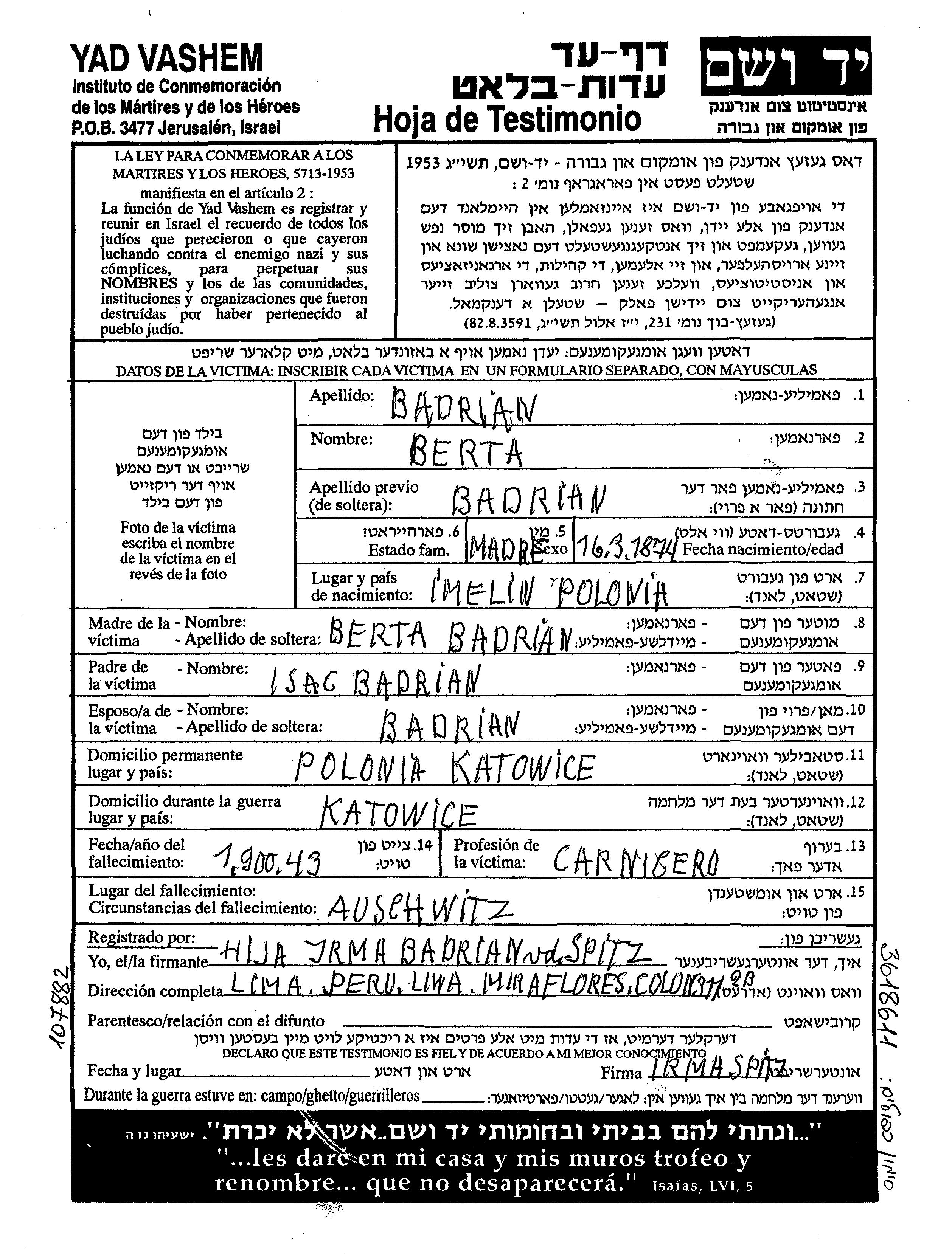 ברטה בדריאן לבית בדריאן נולדה בImelin שבפולין בשנת 1874 לIsac וברטה. היא היתה קצבית. לפני מלחמת העולם השניה התגוררה בKatowice שבפולין. בזמן המלחמה היא היתה בKatowice שבפולין. ברטה נרצחה בשואה. מקום המוות: Auschwitz שבפולין בשנת 1943.