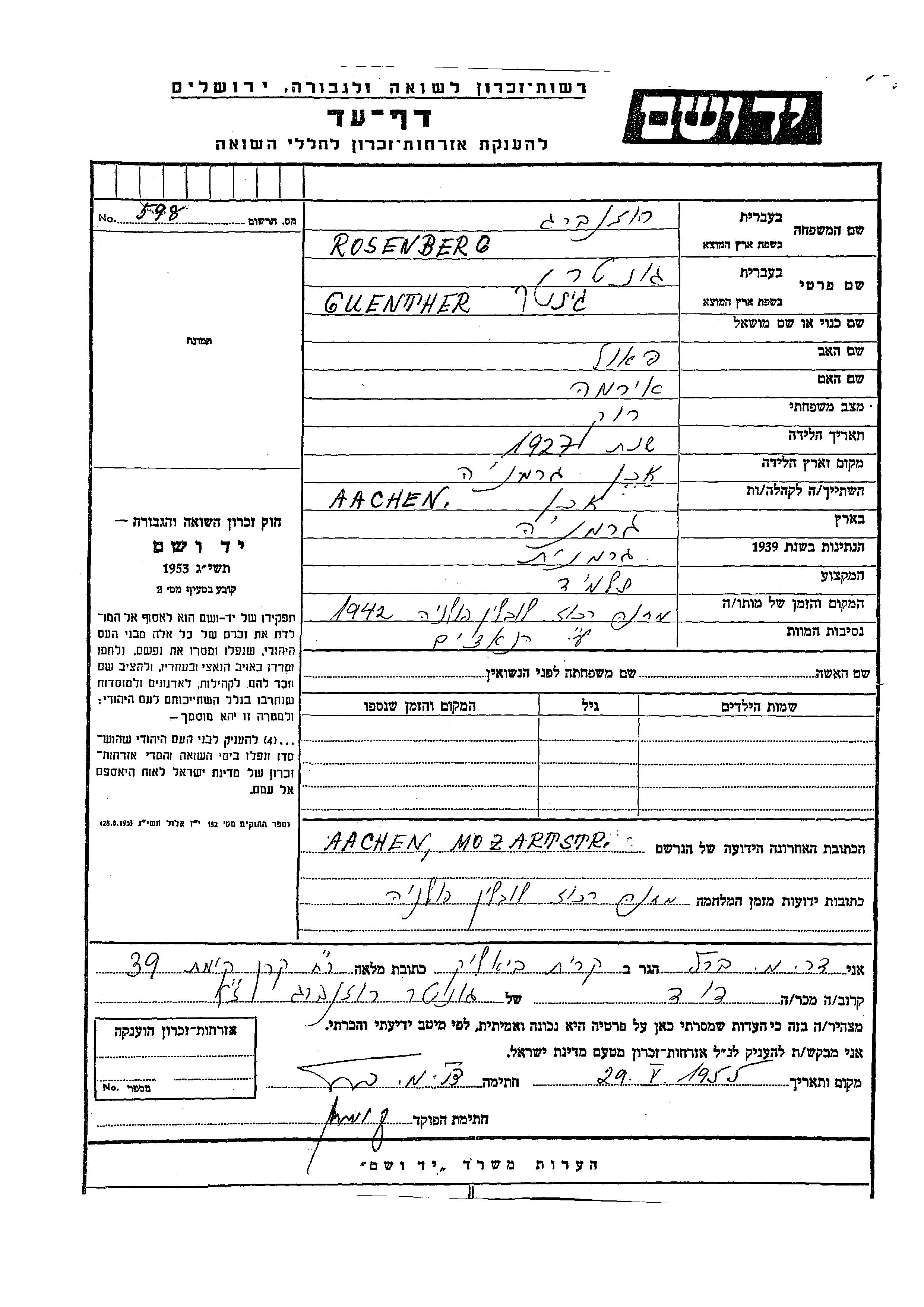 גינטר Rosenberg נולד בAachen שבגרמניה בשנת 1927. הוא היה תלמיד. לפני מלחמת העולם השניה התגורר בAachen שבגרמניה.