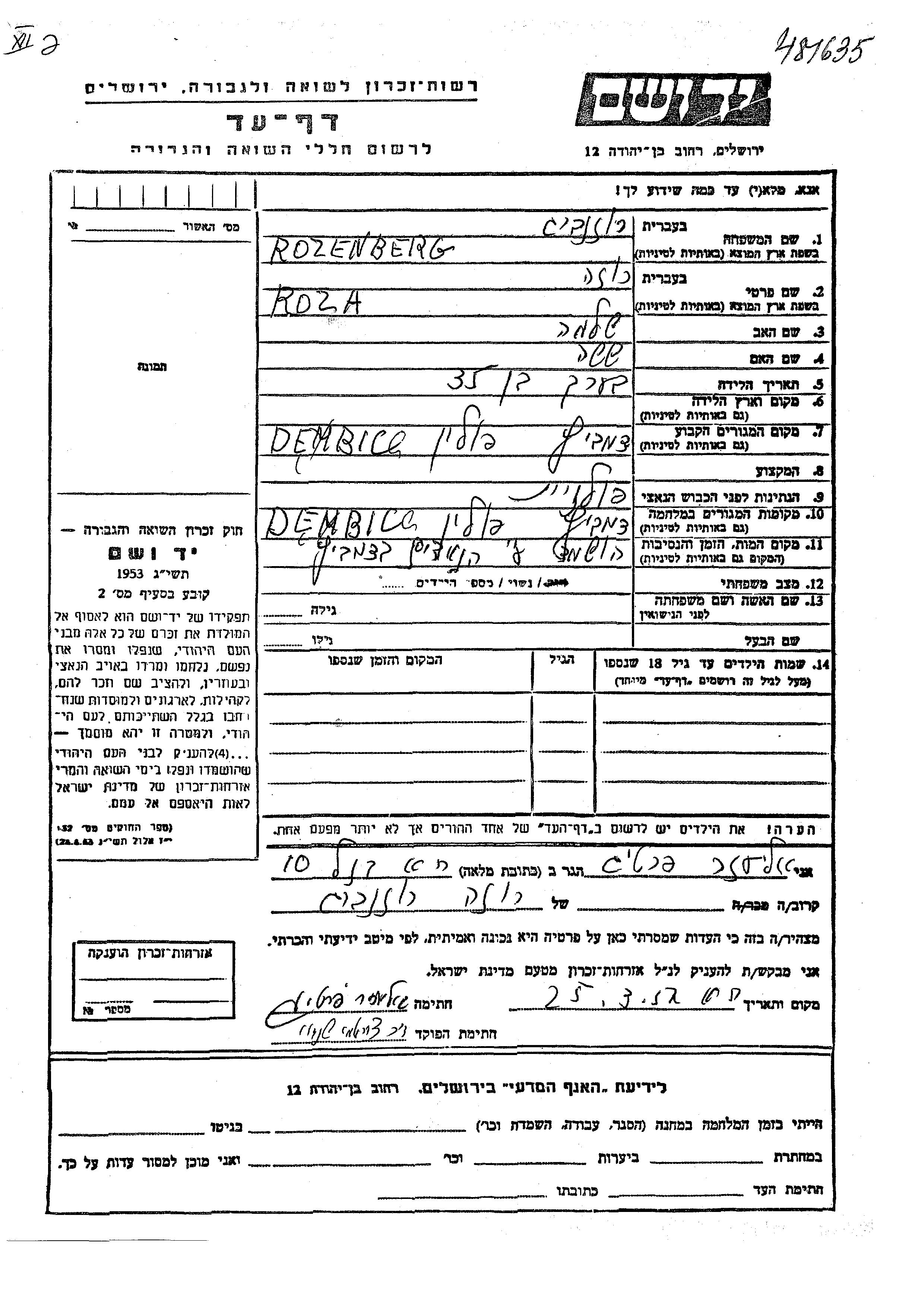 רוזה רוזנברג נולדה לשלמה וששה. היא היתה נשואה. לפני מלחמת העולם השניה התגוררה בDembica שבפולין. בזמן המלחמה היא היתה בDembica שבפולין. רוזה נרצחה בשואה.