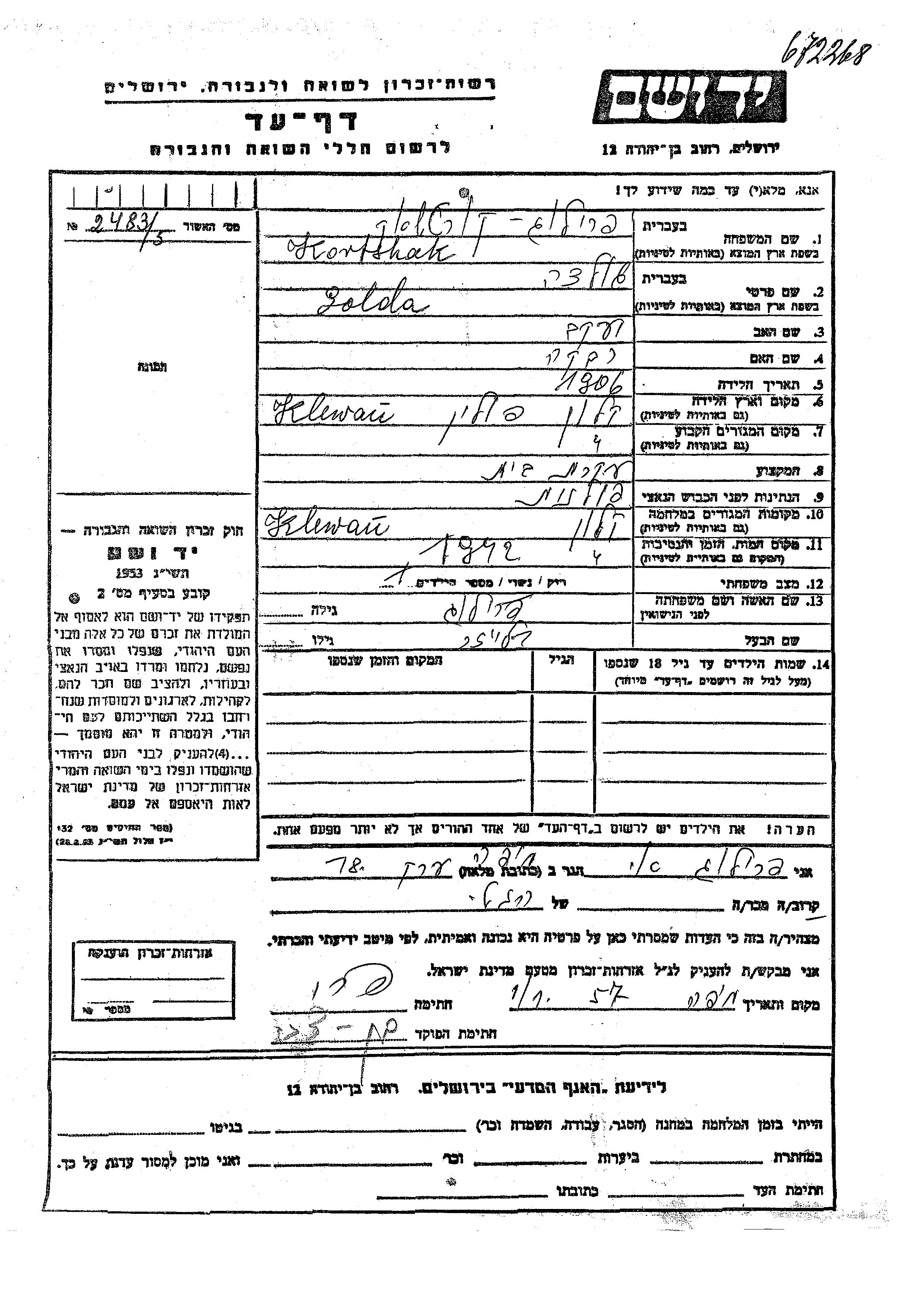 גולדה Kortshak לבית פרילוג נולדה בKlewań שבפולין בשנת 1906 ליעקב ורבקה. היא היתה עקרת בית ונשואה ללייזר. לפני מלחמת העולם השניה התגוררה בKlewań שבפולין. בזמן המלחמה היא היתה בKlewań שבפולין. גולדה נרצחה בשואה. מקום המוות: Klewań שבפולין בשנת 1942.
