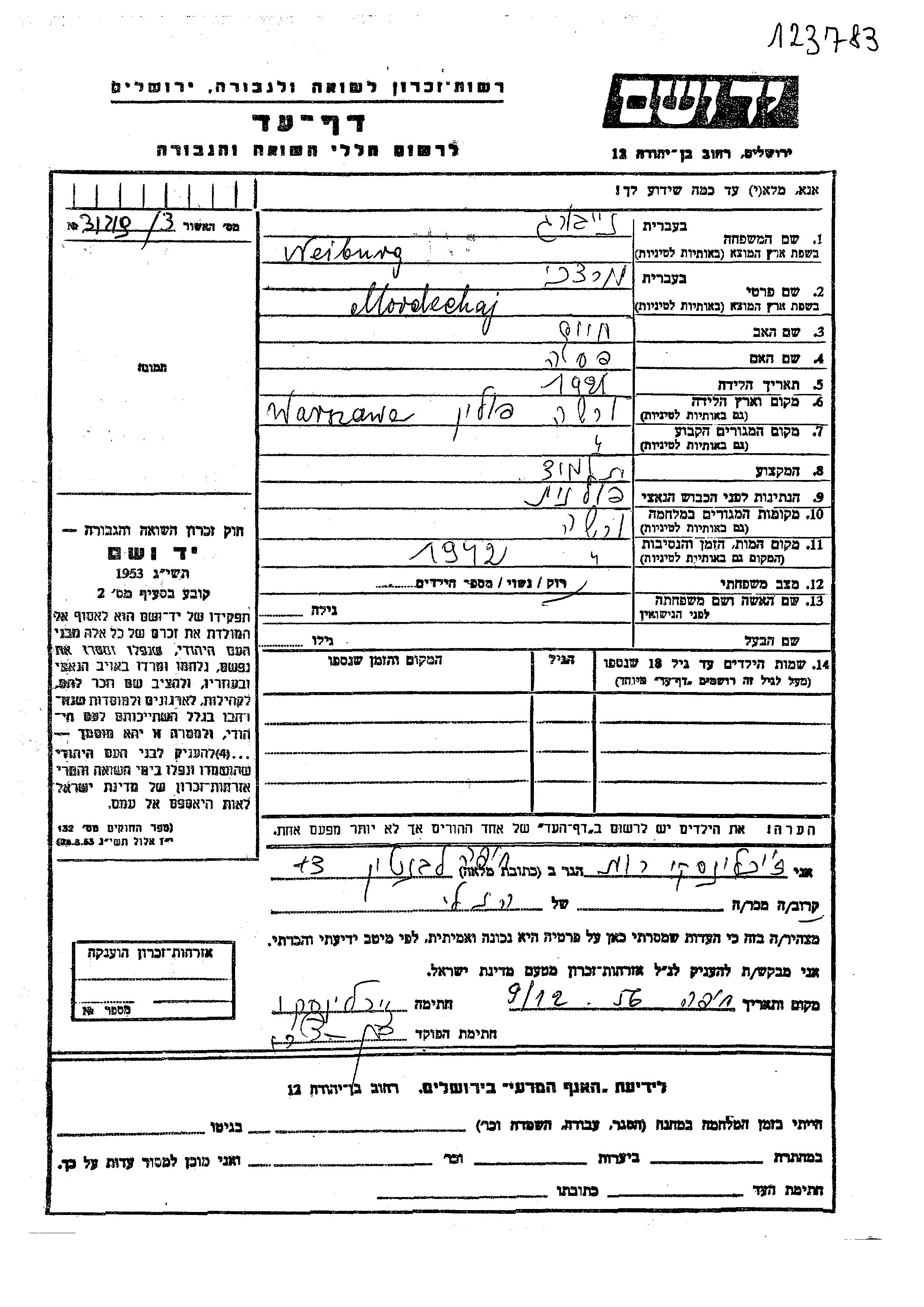 Mordechaj נייבורג נולד בWarsaw שבפולין בשנת 1921 לחיים ופסיה. הוא היה תלמיד ורווק. לפני מלחמת העולם השניה התגורר בWarsaw שבפולין. בזמן המלחמה הוא היה בWarsaw שבפולין.