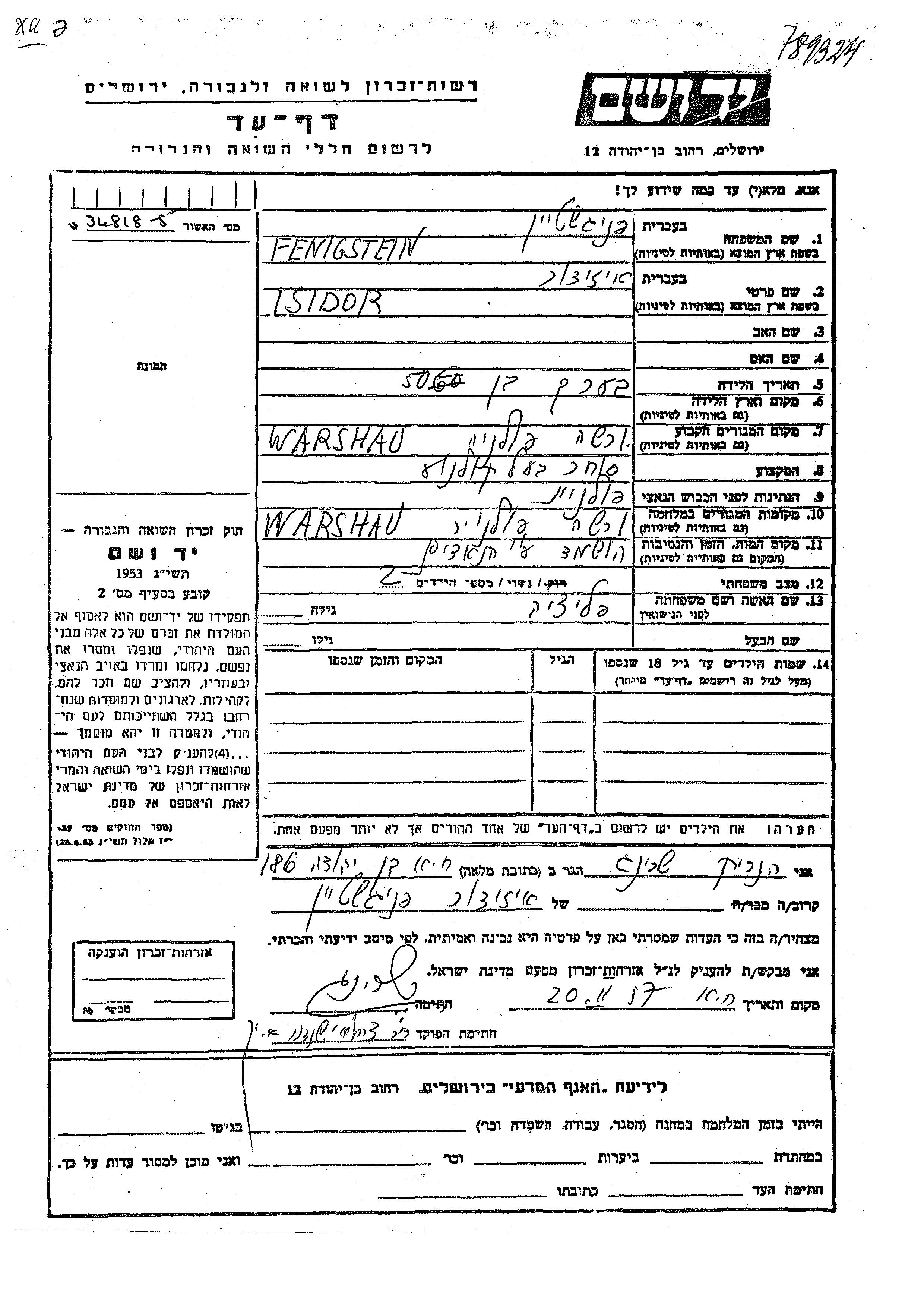 Isidor Fenigstein. הוא היה סוחר ונשוי לפליציה. לפני מלחמת העולם השניה התגורר בVarsha שבפולין. בזמן המלחמה הוא היה בVarsha שבפולין.