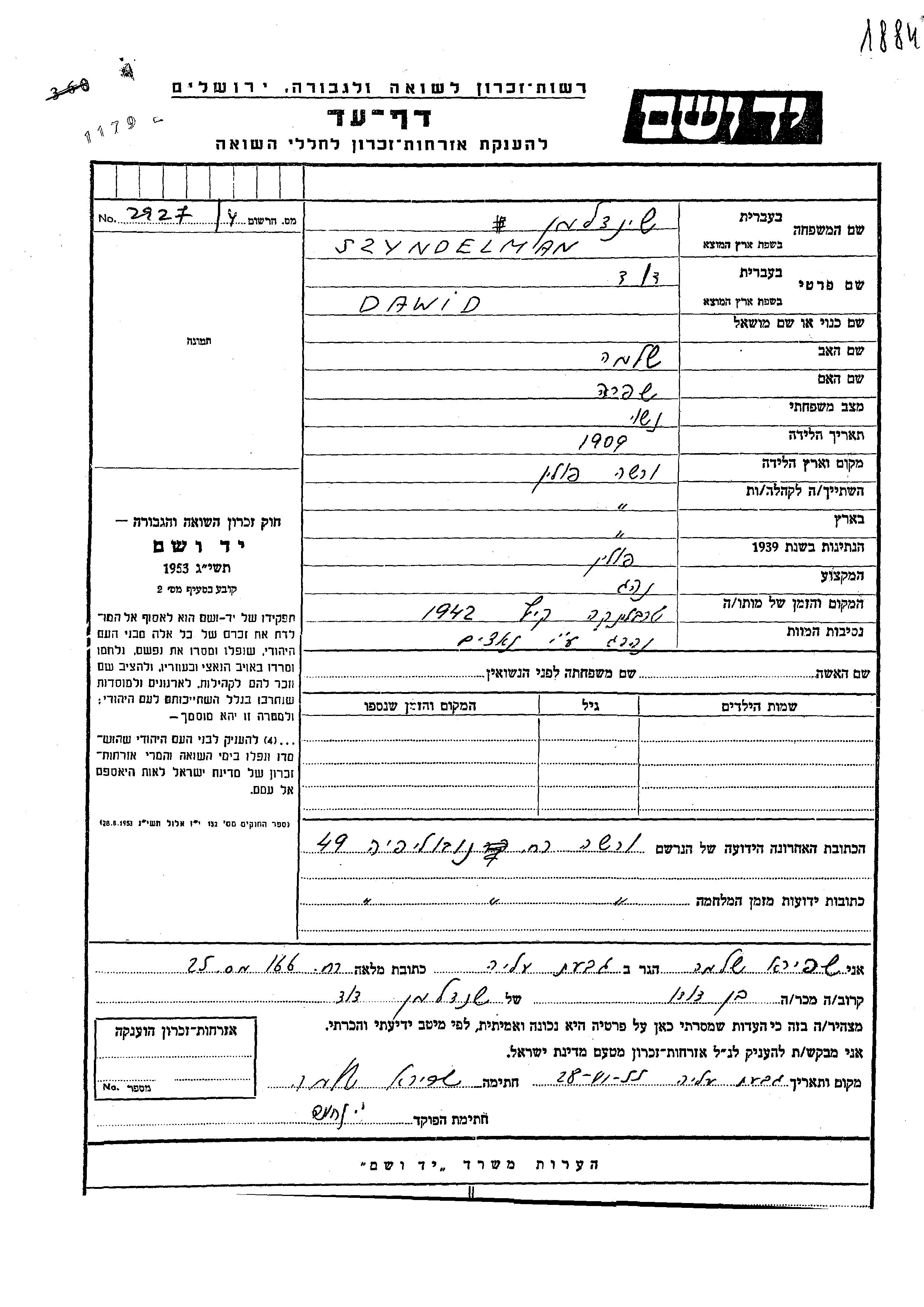 Dawid Szyndelman נולד בWarsaw שבפולין בשנת 1909 לשלמה ושפרה. הוא היה נהג ונשוי. לפני מלחמת העולם השניה התגורר בWarsaw שבפולין. בזמן המלחמה הוא היה בWarsaw שבפולין. הוא נרצח בשואה. מקום המוות: Treblinka שבפולין בשנת 1942.